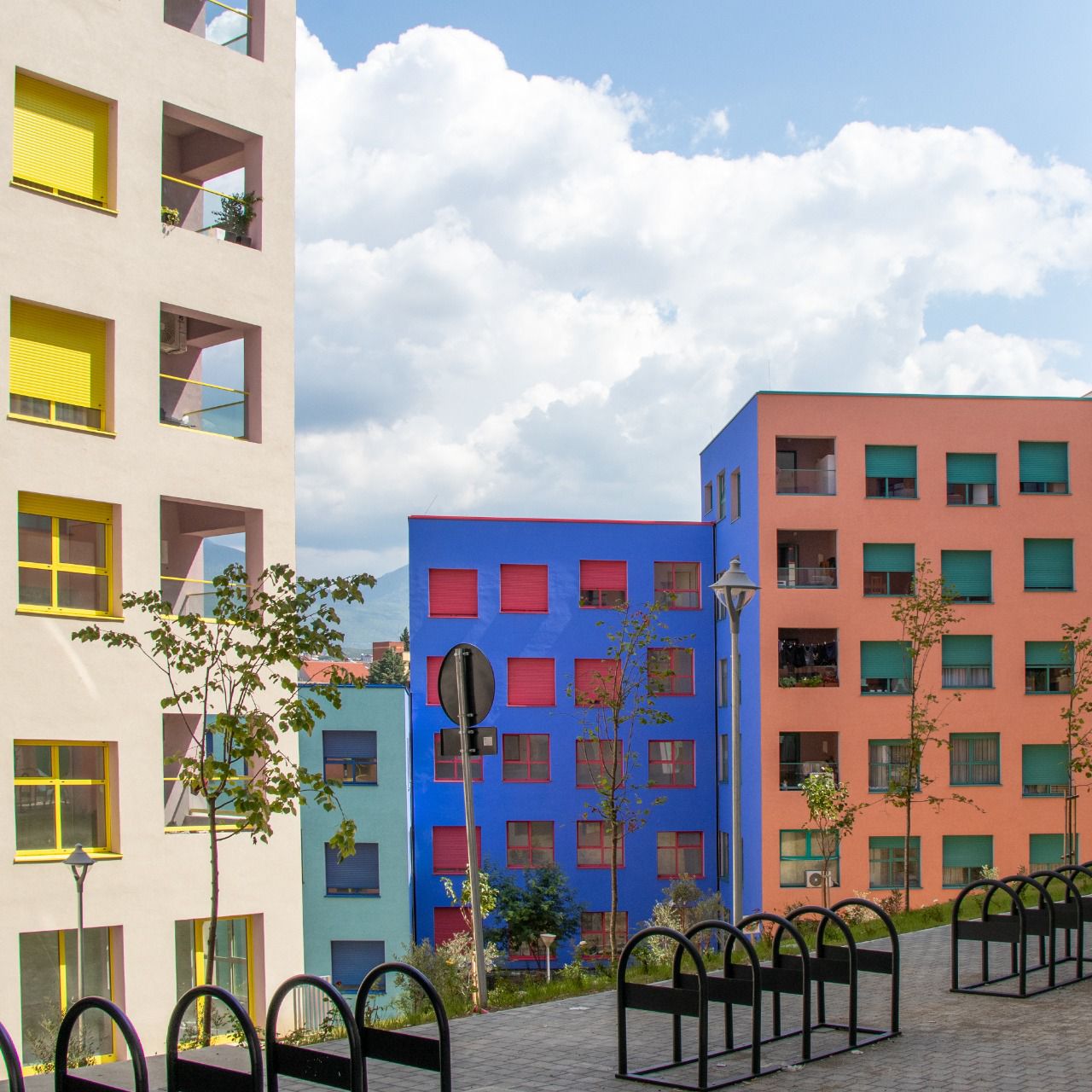 재료와 색채 전략은 절제된 수단 안에서 다양성을 실험한다. 외벽, 창틀, 셔터에 제한된 색상 팔레트를 다양한 조합으로 적용해 각 동마다 서로 다른 표정을 형성했다. 이는 티라나 전 시장 에디 라마가 2000년대 초반 공산주의 시기의 아파트 단지를 색채로 재정비했던 도시 정책에 대한 간접적 참조이기도 하다.