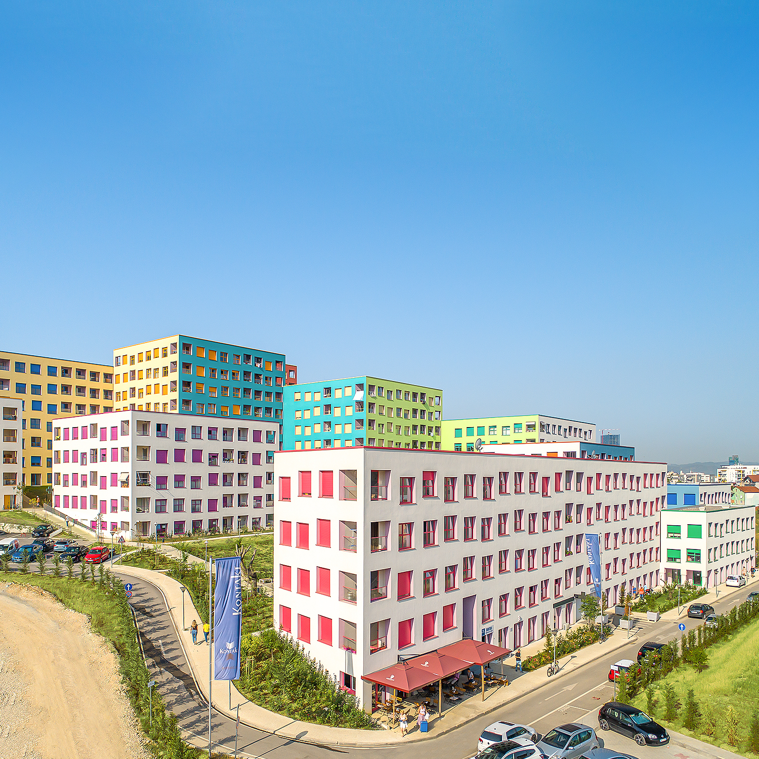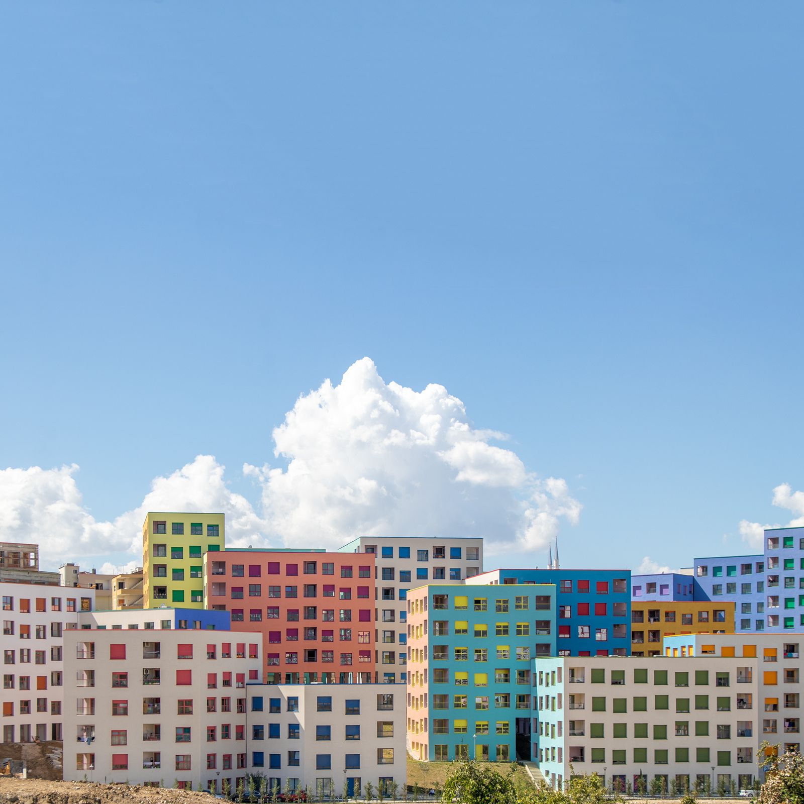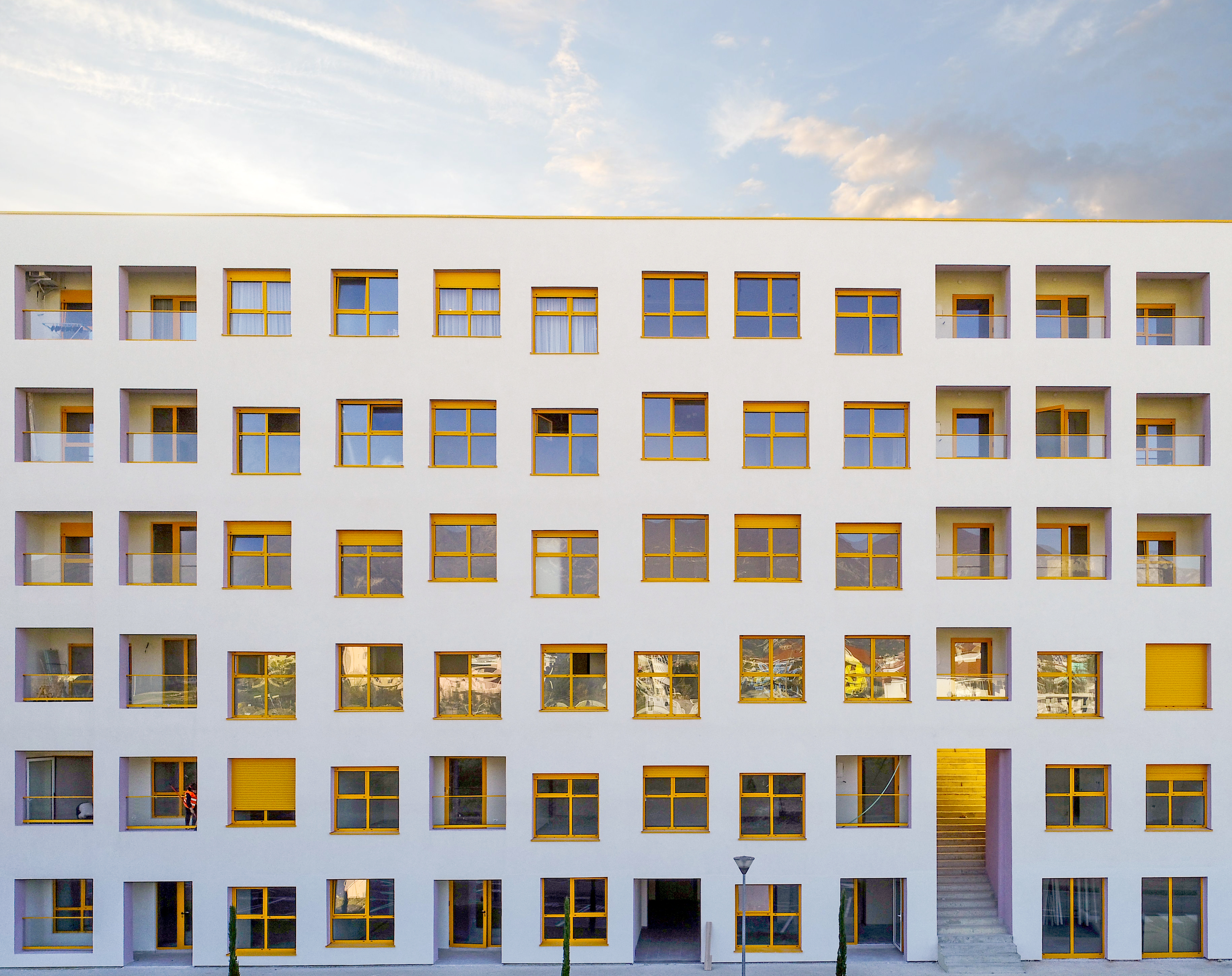 프로젝트는 소형 아파트 블록을 체커보드 패턴으로 배열하여, 불규칙하게 증식해온 주변 도시 조직과 상응하는 밀도를 형성했다. 각 동은 서로 다른 크기를 갖지만 동일한 구조 원리를 공유한다. 단일 창호 유형을 반복 적용해 외관을 구성함으로써, 의도된 무작위성처럼 보이는 개구 패턴을 만들어냈다.