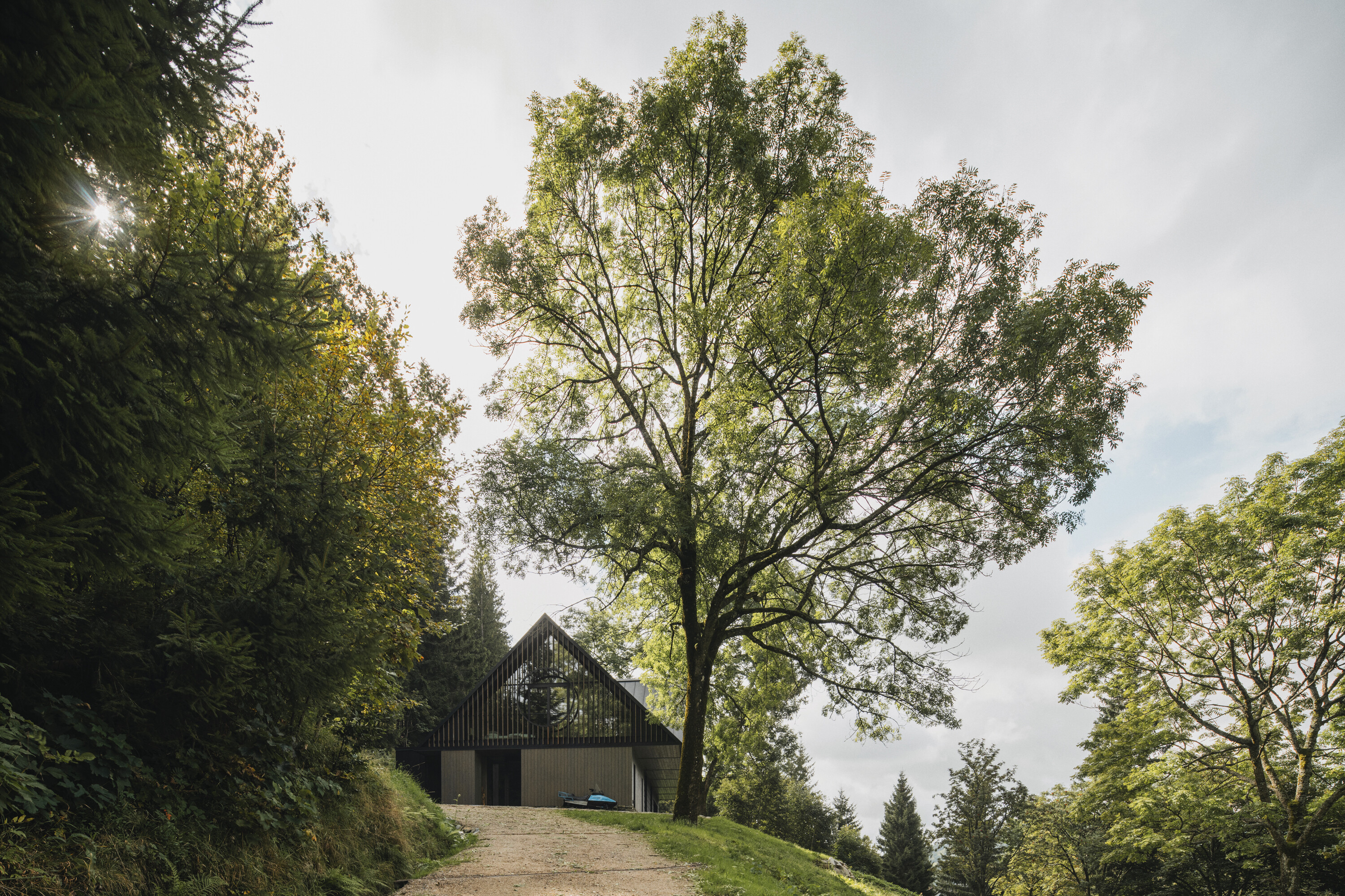 크르코노셰 지역 건축은 거대한 급경사 지붕으로 정의된다. 긴 겨울을 견디기 위한 구조이며, 낮은 통나무 매스 위에 비대칭 지붕이 얹히고, 건초 다락창과 판재 박공, 석재 기단, 전통적인 3분 구성 평면이 특징이다. 이번 프로젝트는 바로 그러한 유형의 집을 오늘의 맥락 안에서 다시 자리 잡게 하는 작업이었다.