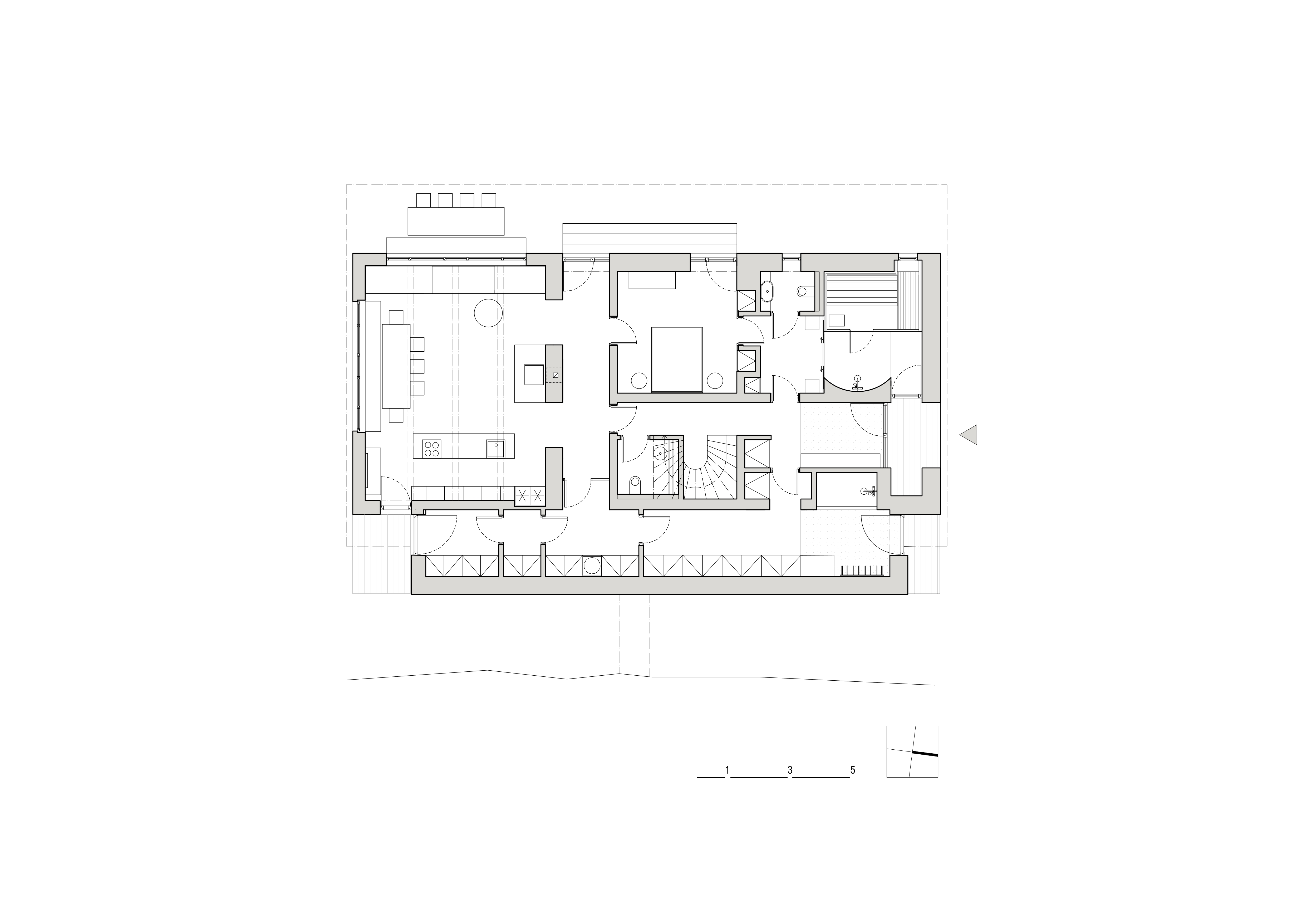 지상층의 중심은 대형 테이블과 창가 붙박이 좌석이 놓인 거실이다. 기존 매스 안에는 게스트 침실과 계단이 삽입되었다. 사회주의 시기에 추가되었던 화장실은 사우나로 전환되었다. 경사면과 기존 매스 사이에는 수납 및 기술 공간을 삽입해 팬트리, 세탁실, 스키·자전거 장비 보관실, 작업실, 설비실, 반려견과 자전거를 위한 세척 공간을 마련했다.