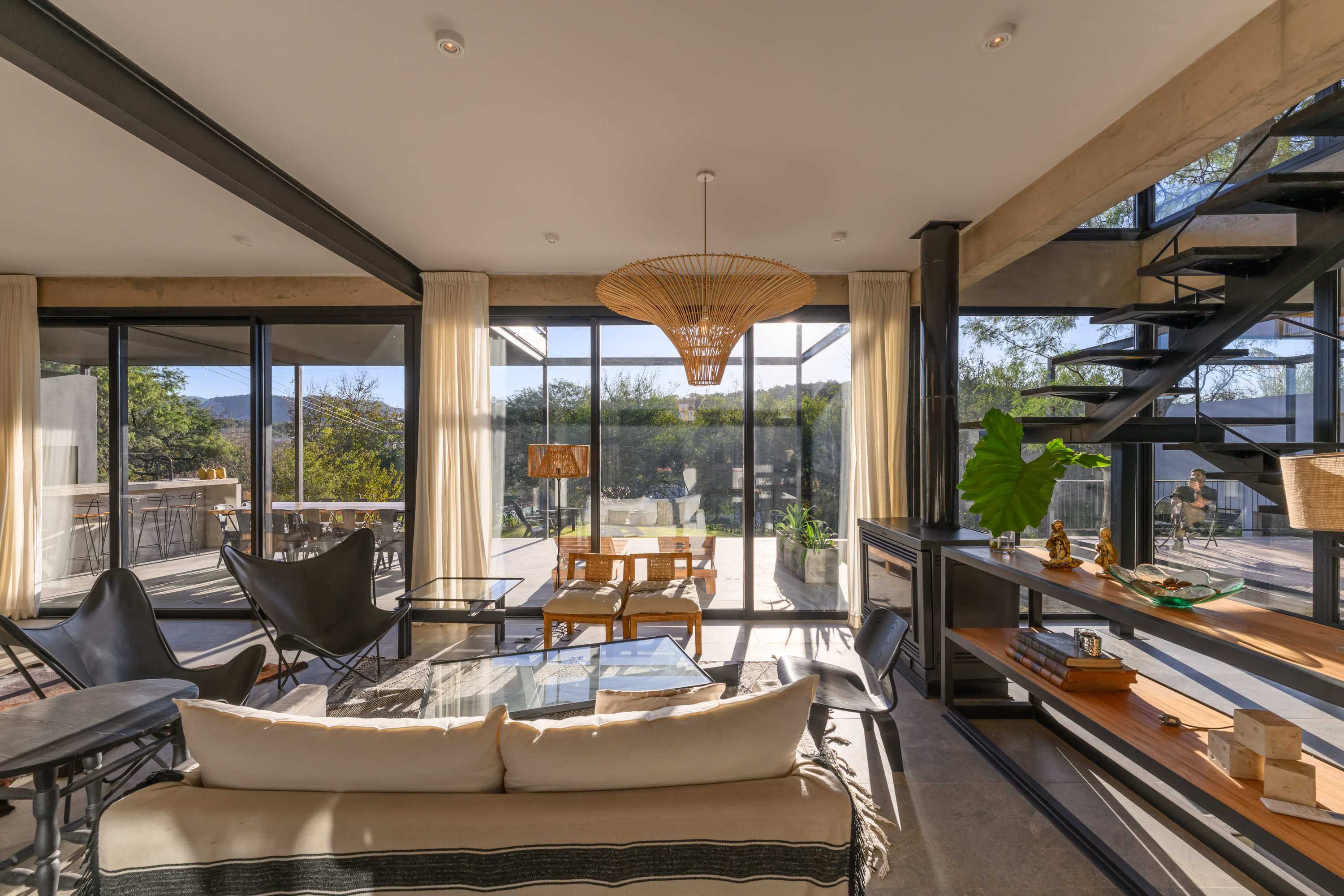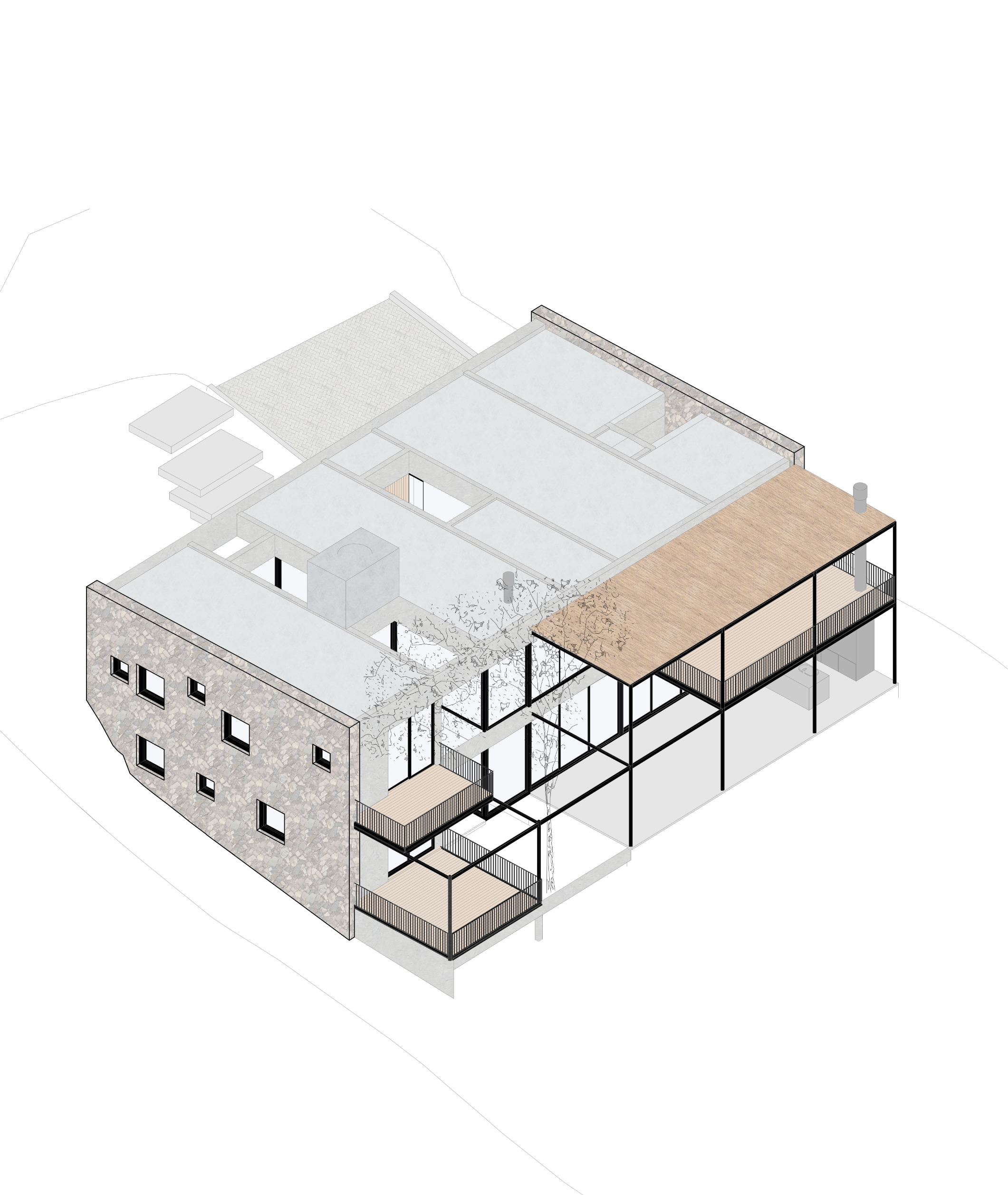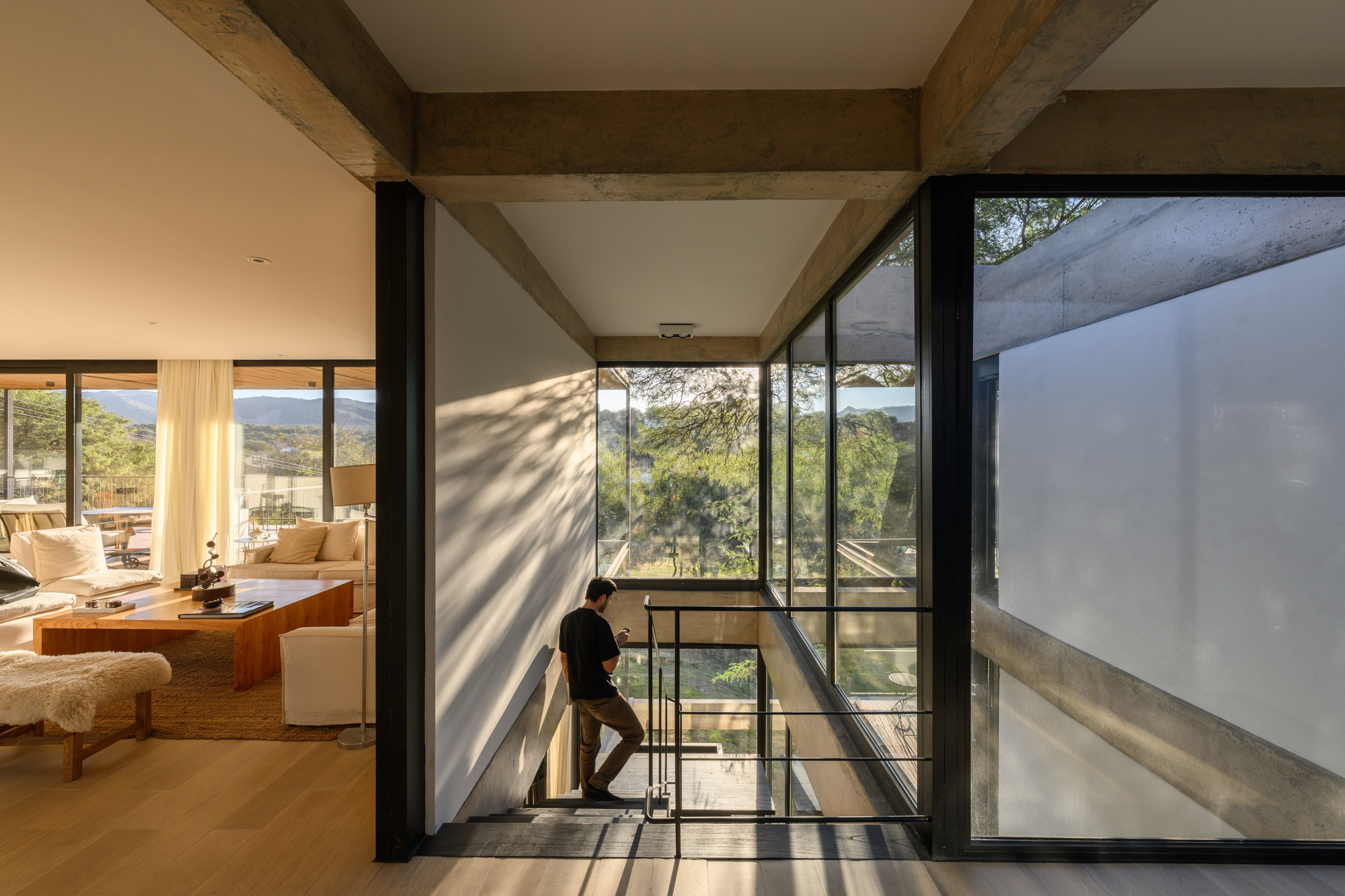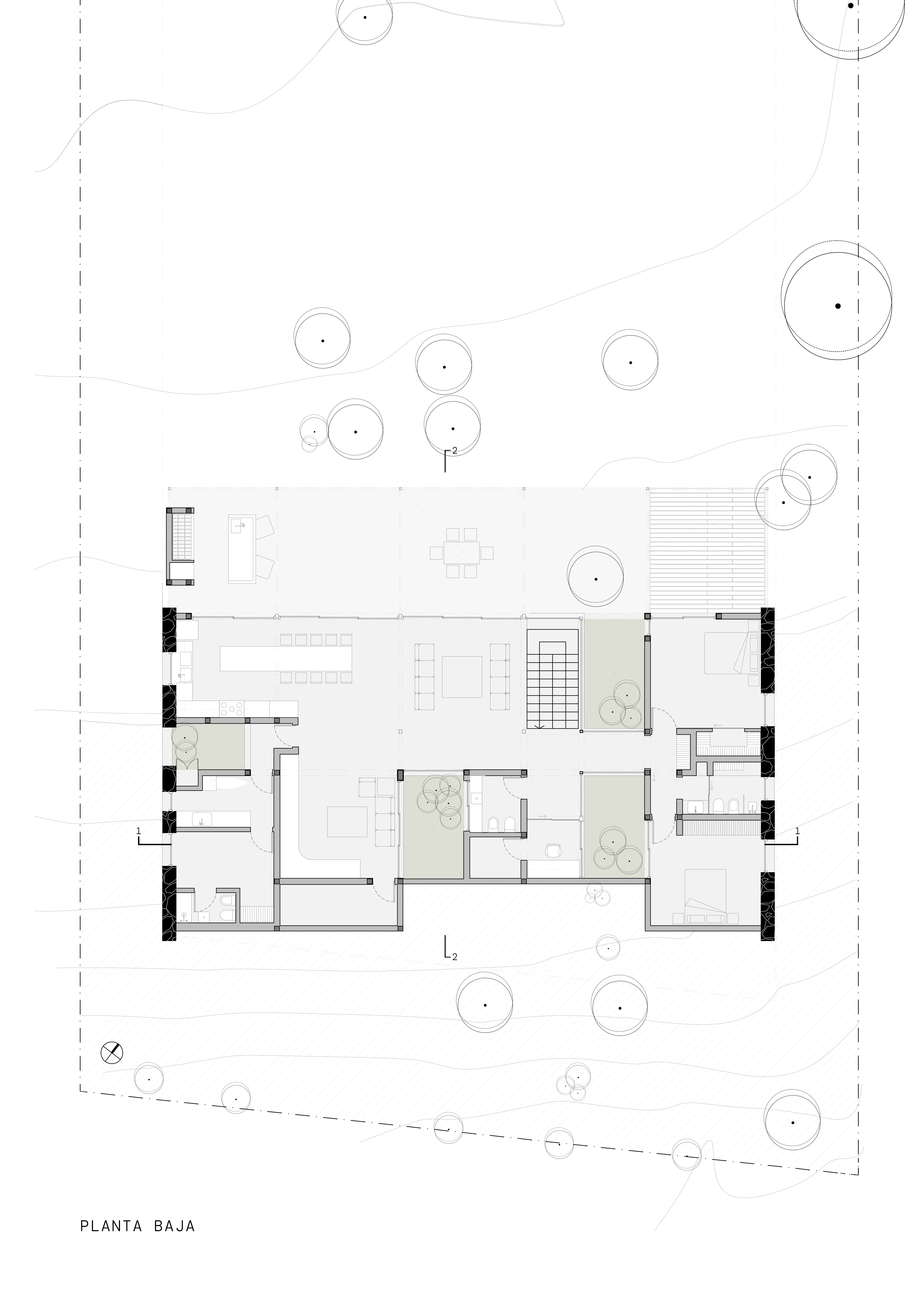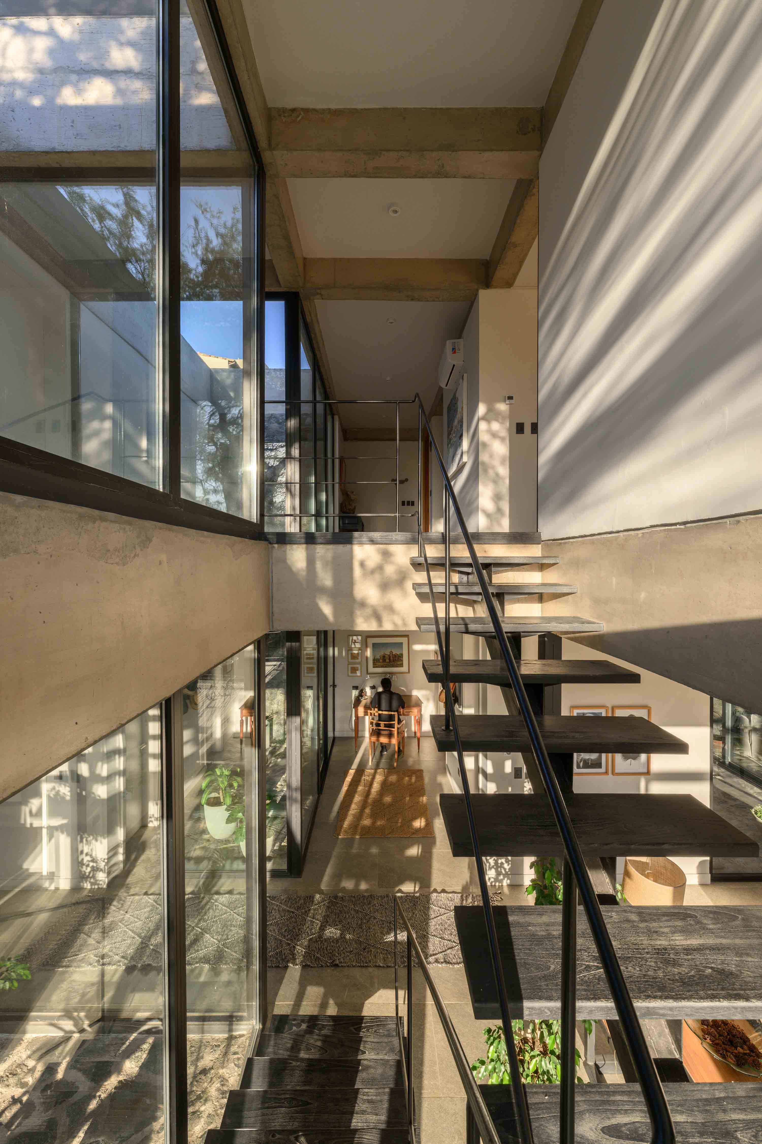 대지의 자연 지형을 따르는 전략 역시 주요한 설계 전제였다. 상부 레벨에서 진입이 이루어지며, 내부로 내려가는 동선이 형성된다. 이 하강의 과정은 공간 경험을 예고하는 장치이다. 중심에는 알가로보 나무가 위치한다. 이 나무를 중심으로 순환과 시선, 구조가 조직된다. 중정과 계단, 시각적 연결이 교차하는 이 코어는 공적 영역과 사적 영역을 구분하는 동시에, 공간 전체를 통합한다.