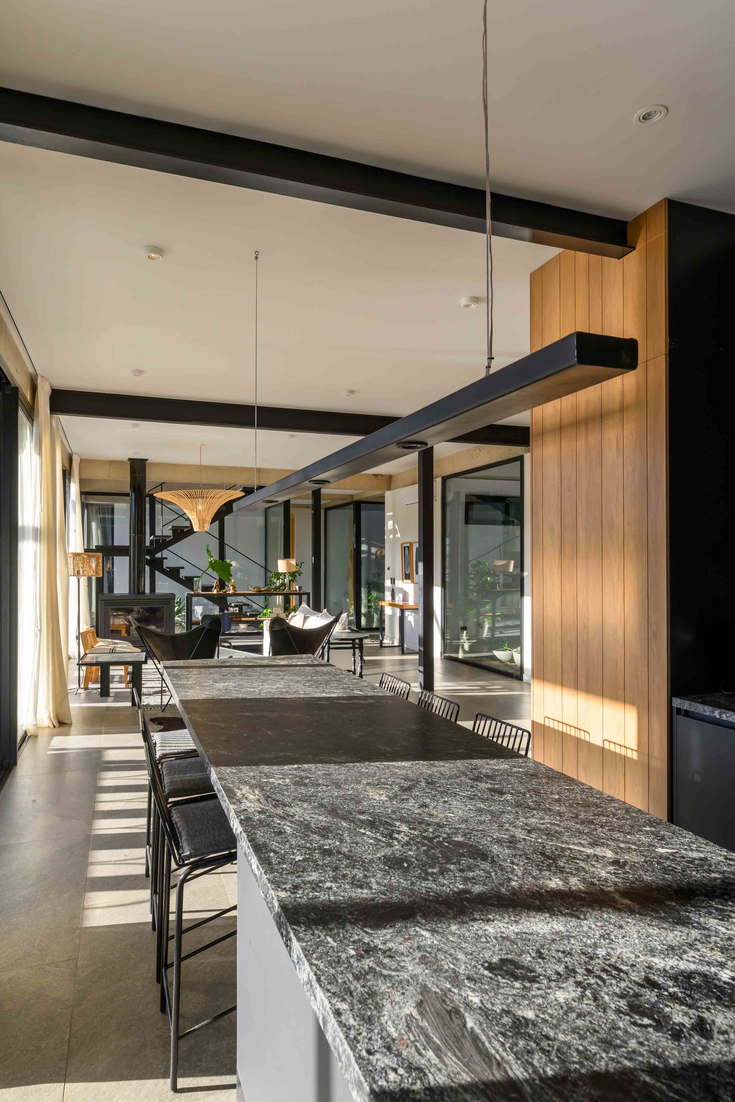 주택은 두 개의 레벨로 구성된다. 상층은 일상적이고 친밀한 프로그램이 배치된 영역이다. 보다 따뜻하고 사적인 분위기가 강조된다. 반면 하층은 사회적 성격이 강하다. 클라이언트의 활발한 사회 활동을 반영해 공간은 서로 긴밀히 연결되고, 외부와도 직접적으로 맞닿는다. 재료는 더 어둡고 거친 질감을 띠며, 집합적 사용을 전제로 한 공간적 연속성을 형성한다.
