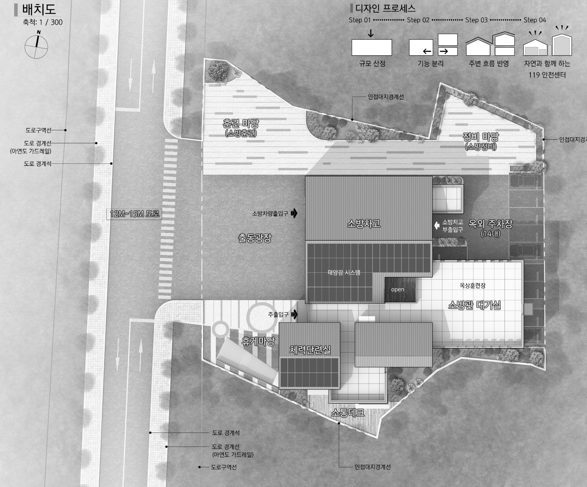전면의 출동공간은 가장 명확하고 직관적인 흐름을 갖도록 두고, 그 주변으로 훈련마당과 정비마당, 휴게마당을 배치하여 기능과 일상이 서로를 방해하지 않도록 정리하였다. 이 외부공간들은 단순한 여유 공간이 아니라, 긴장된 업무 사이사이 짧은 호흡을 만들고, 훈련과 점검, 휴식이 자연스럽게 이어지도록 돕는 실질적인 생활의 장면들이다. 도시를 향해 열려 있는 전면의 대응 공간과, 내부로 갈수록 차분히 가라앉는 외부 마당의 구성은 이 건축이 가진 두 얼굴을 동시에 보여준다.