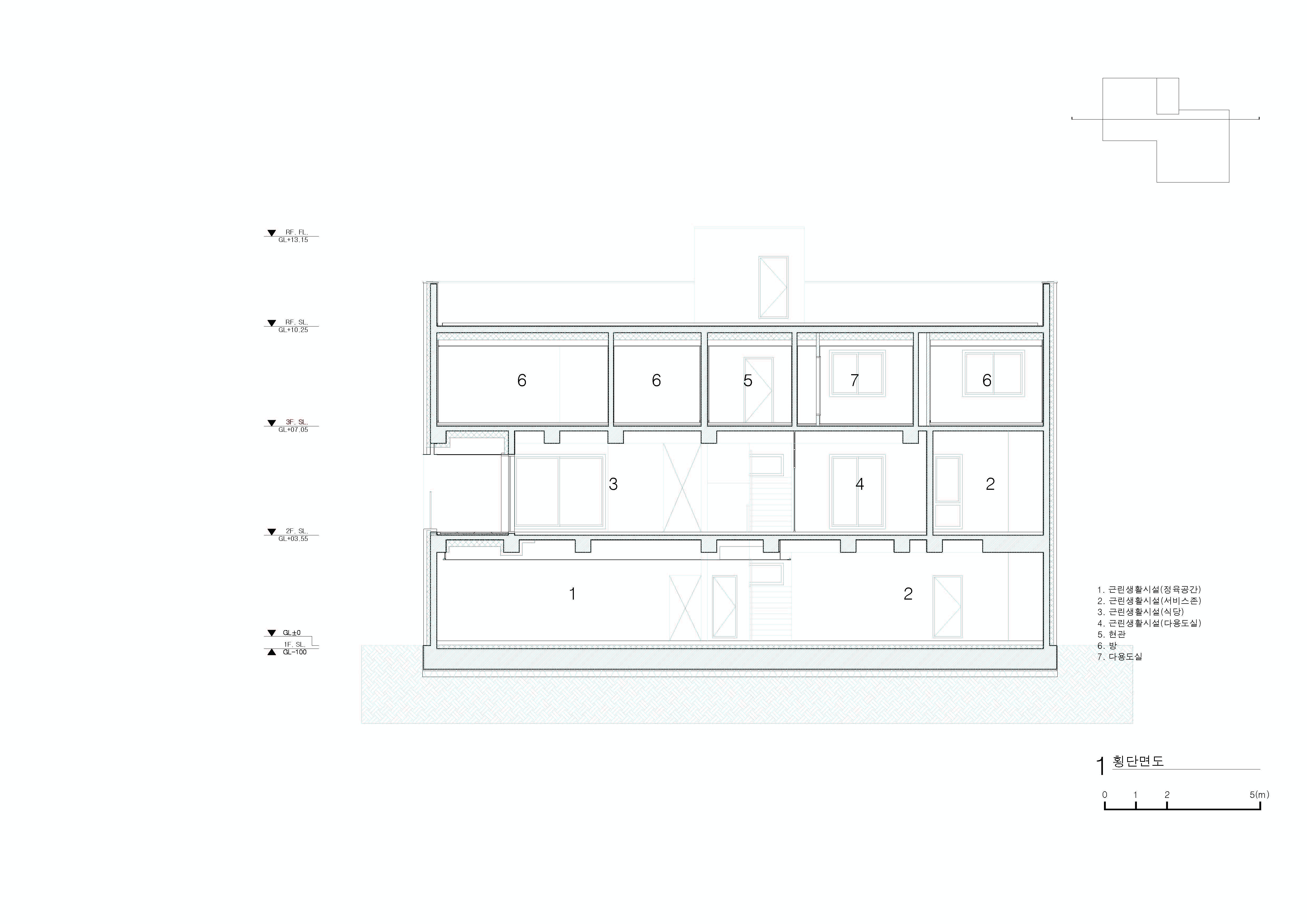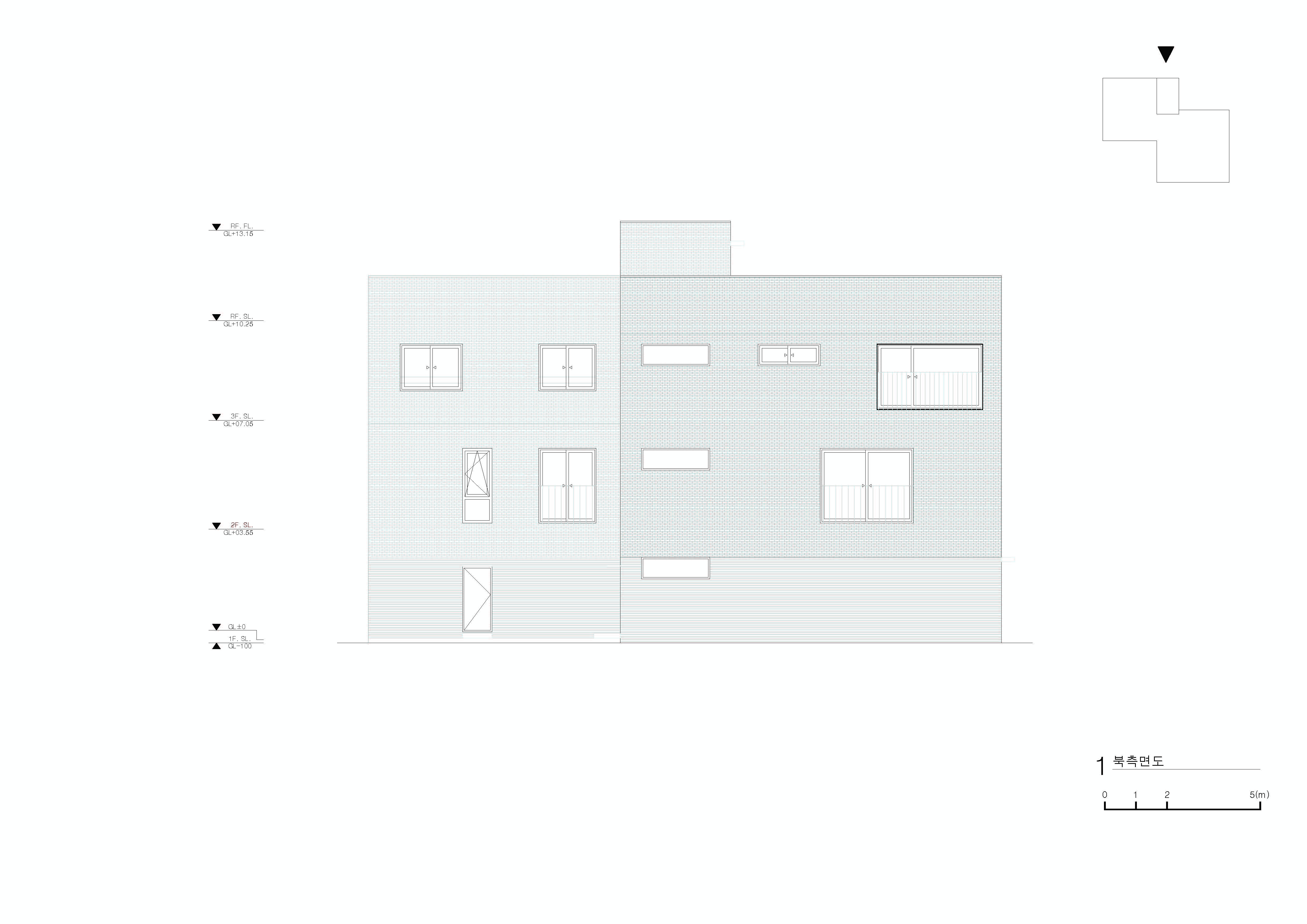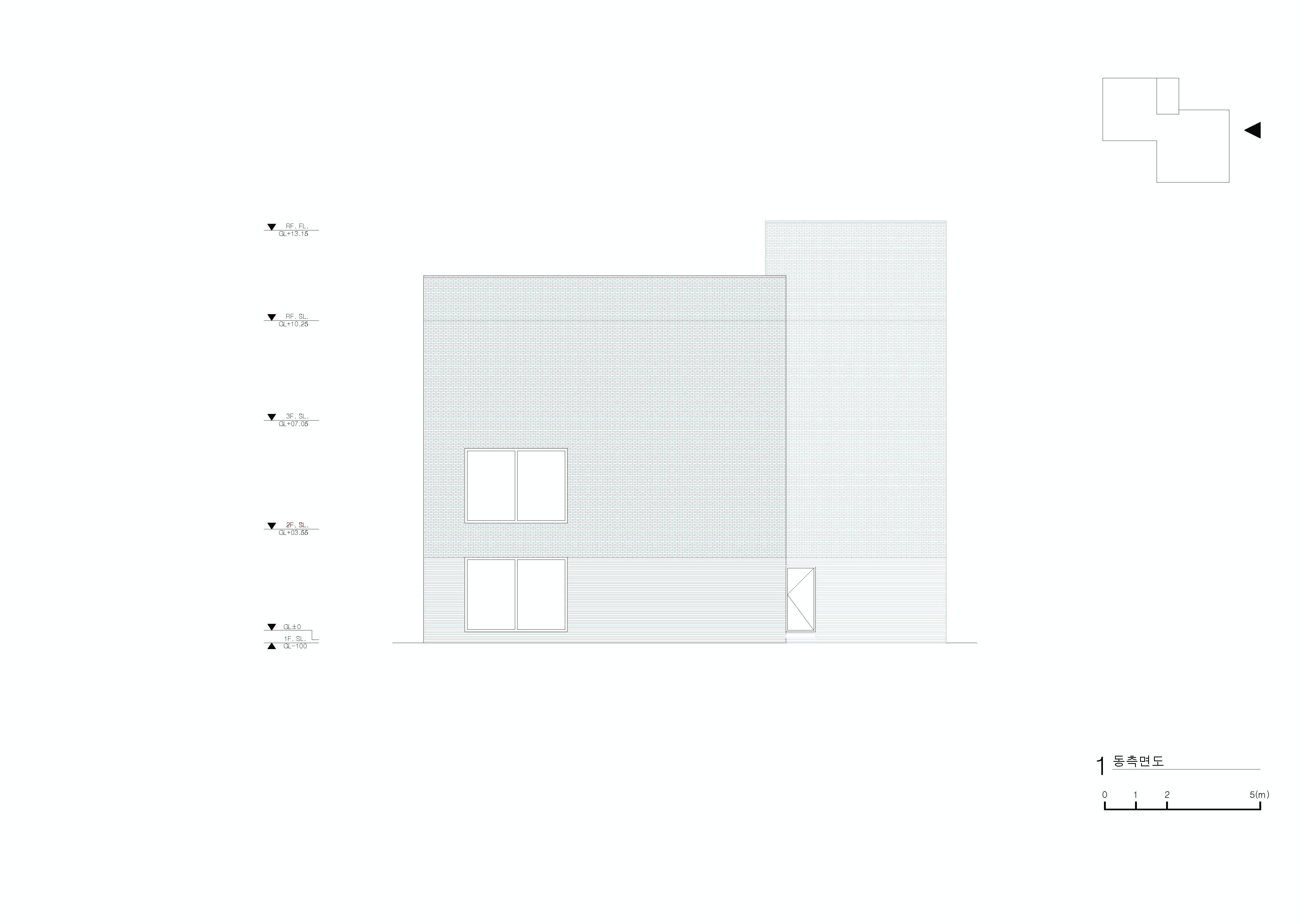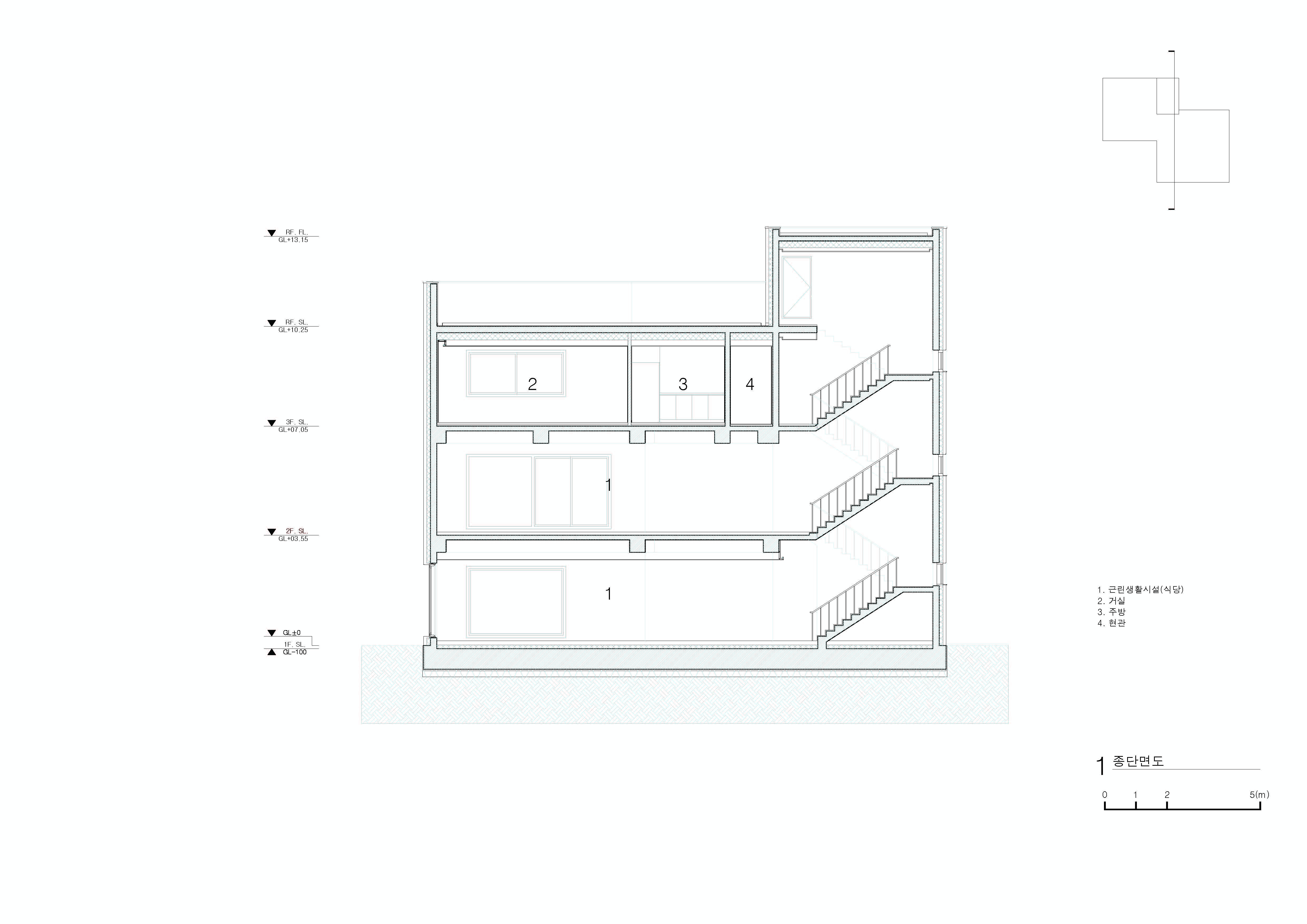 프로그램은 명확하다. 1층과 2층은 일반음식점으로 구성되고, 3층에는 두 세대를 위한 거주 공간이 배치된다. 일과 생활이 수직적으로 겹쳐지며, 가족의 서사가 건물 전체를 관통한다.