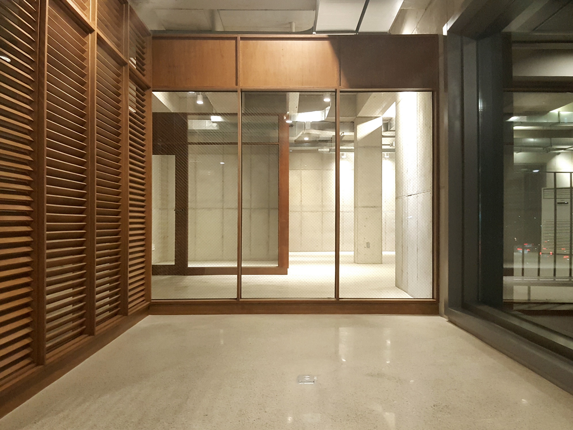 내부는 노출콘크리트가 주된 벽체를 형성한다. 다소 차갑게 느껴질 수 있는 콘크리트의 시각적 온도를 완화하기 위해, 칸막이 벽에는 합판 위 오일스테인을 마감재로 사용했다. 거친 재료와 따뜻한 목질 마감이 대비를 이루며 균형을 만든다. 구조적 정직함과 감성적 보완이 동시에 읽힌다.