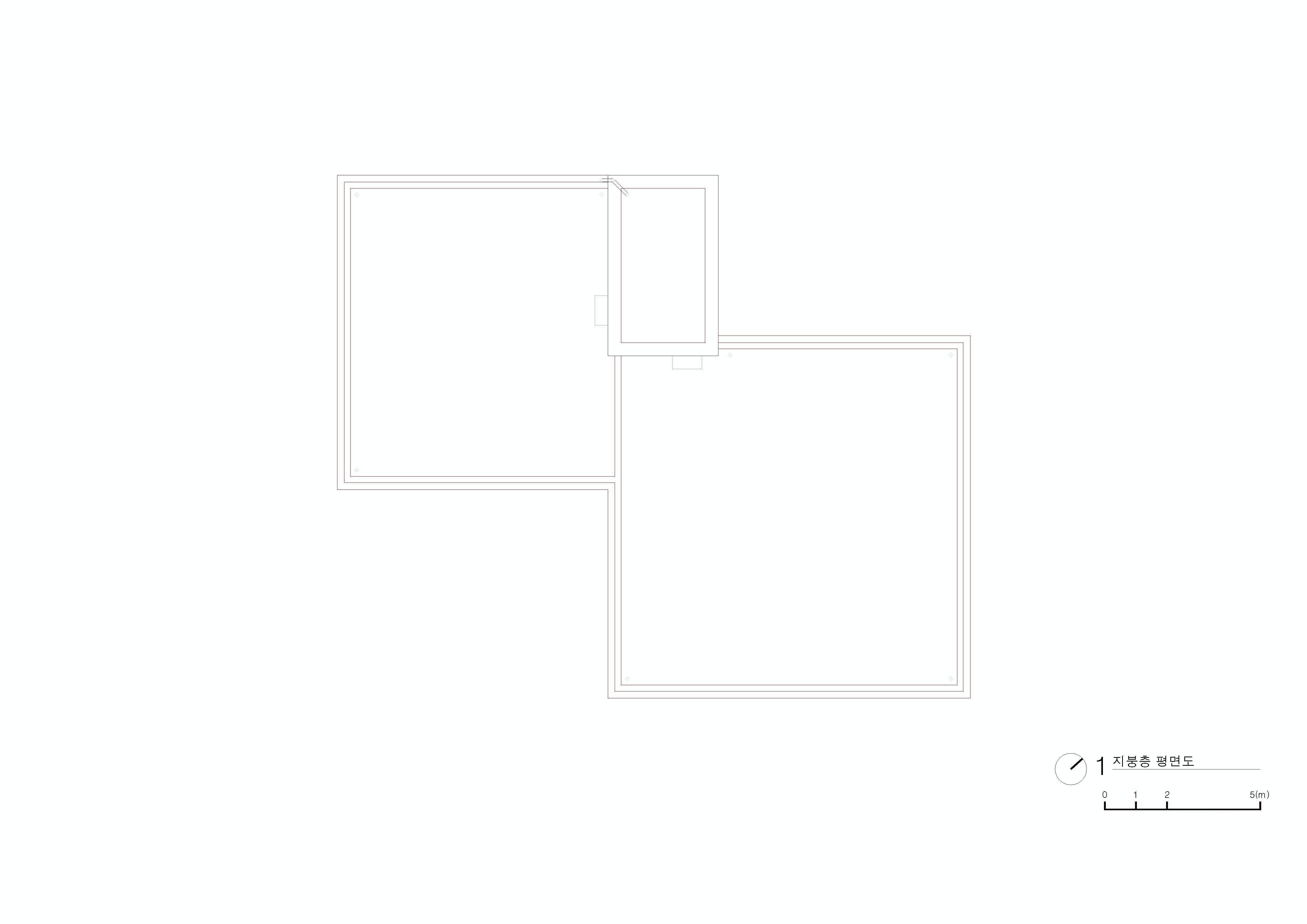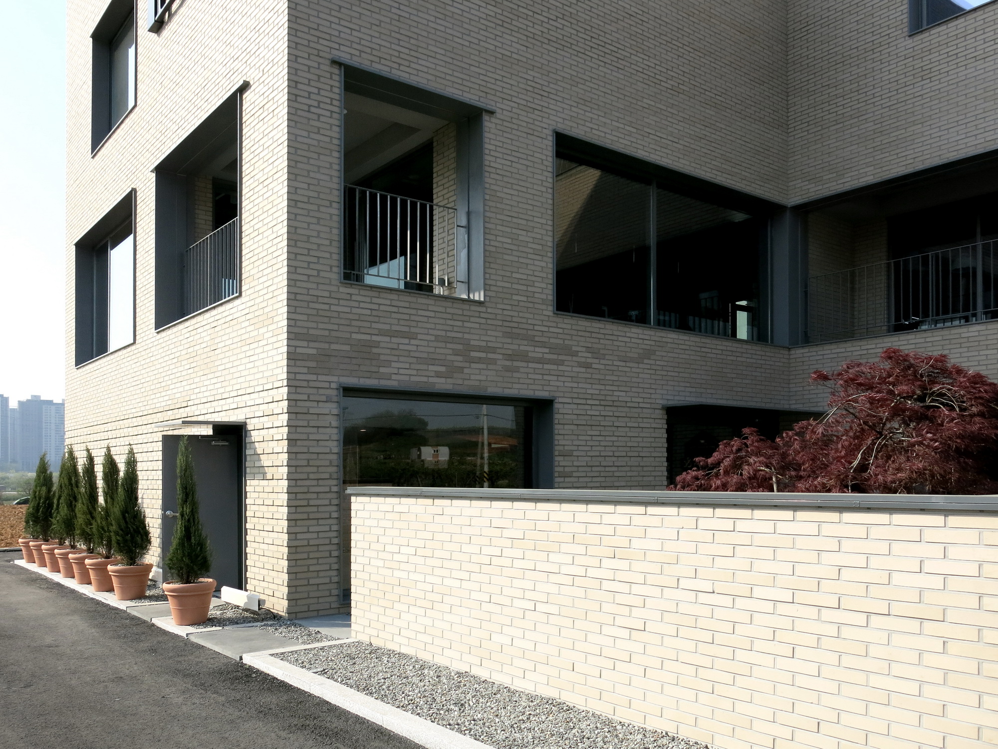 형태는 두 개의 입방체를 교차시키는 방식으로 설정되었다. 이 교차로 인해 자연스럽게 생성된 외부 공간은 기능적으로 구분된다. 전면부는 주 진입을 위한 전이 공간으로 작동하며 방문자의 동선을 정돈한다. 반면 후면부는 설비와 지원 공간으로 계획되어 실질적인 운영을 뒷받침한다. 단순한 매스 조합이 공간의 질서를 만든다.