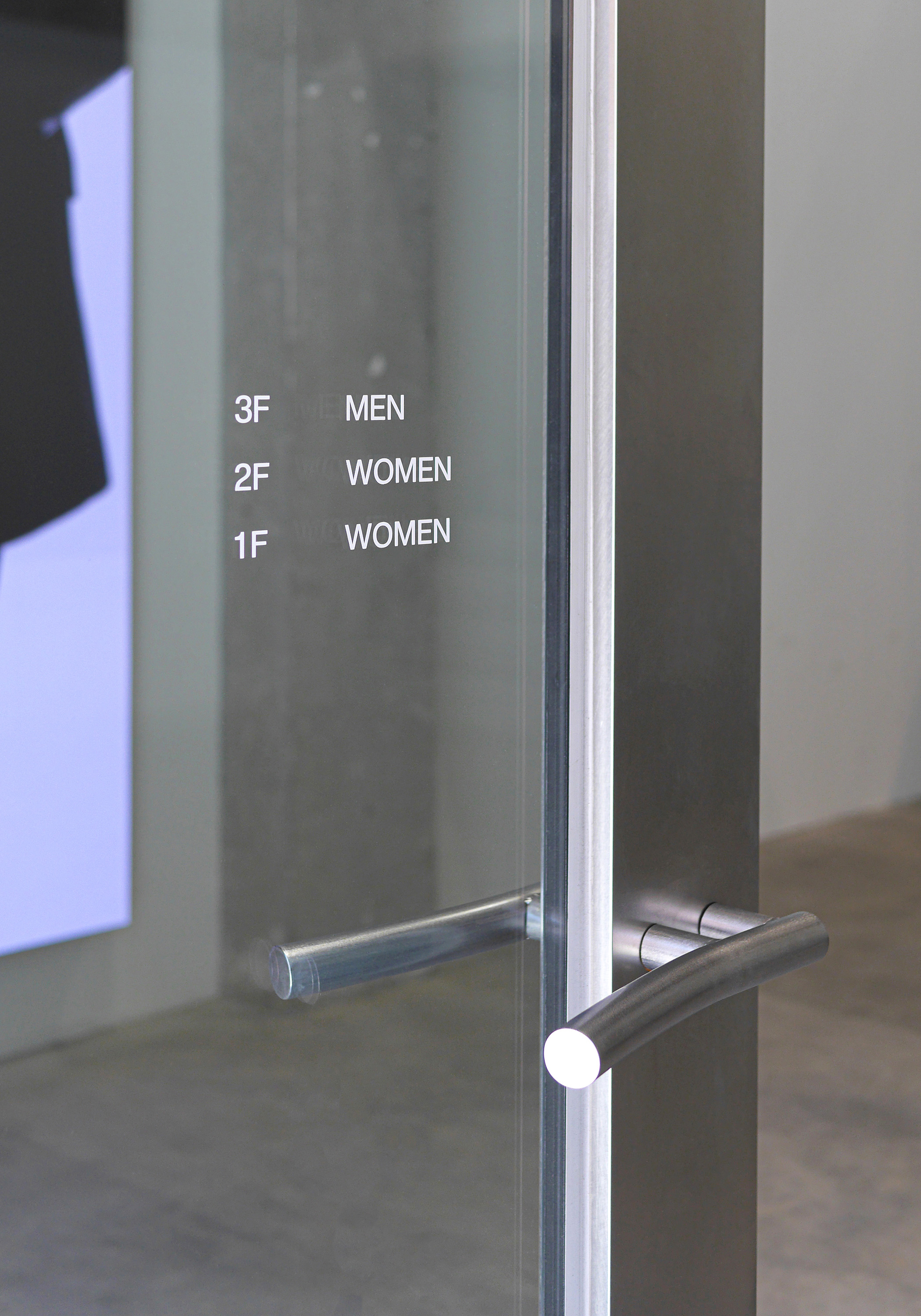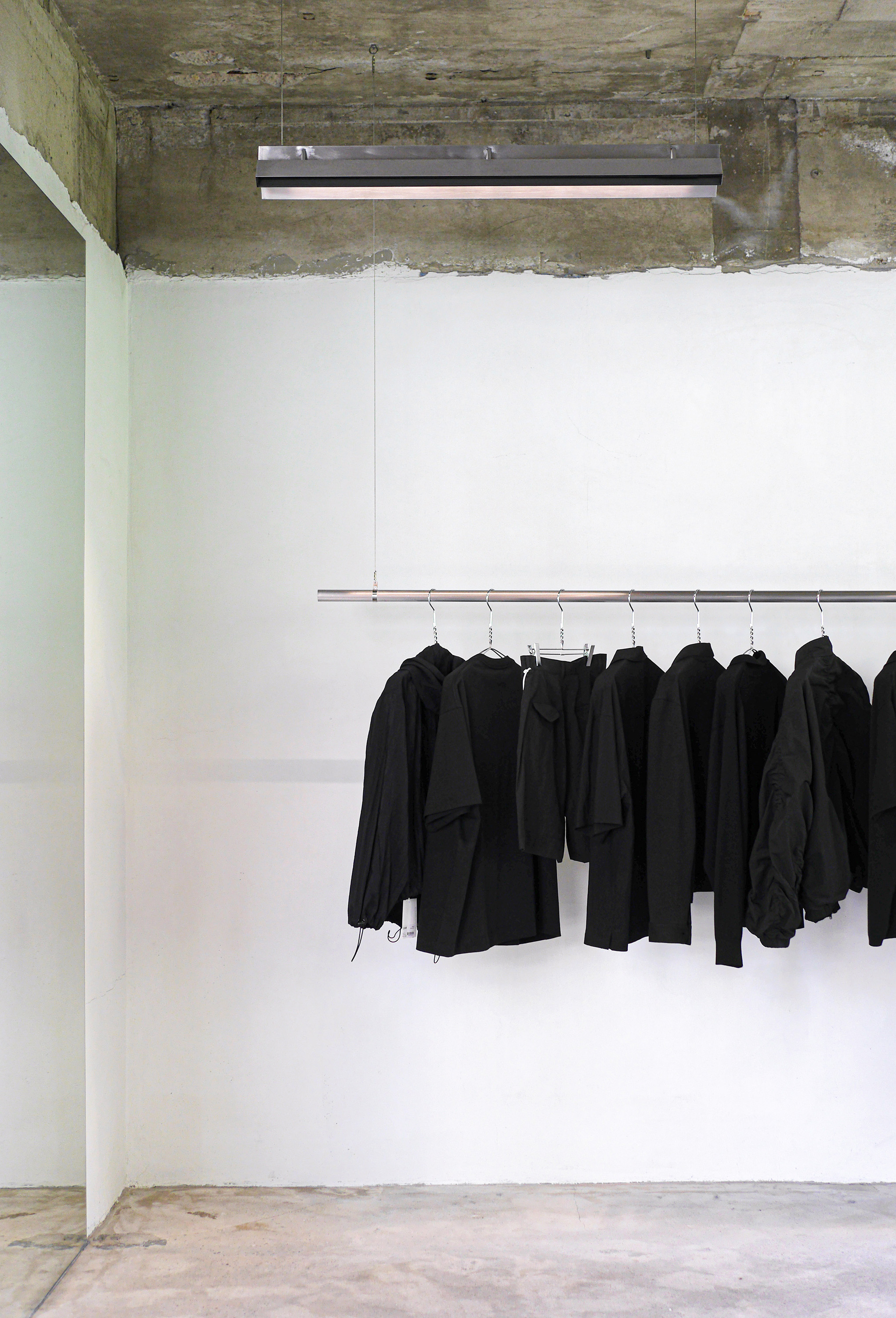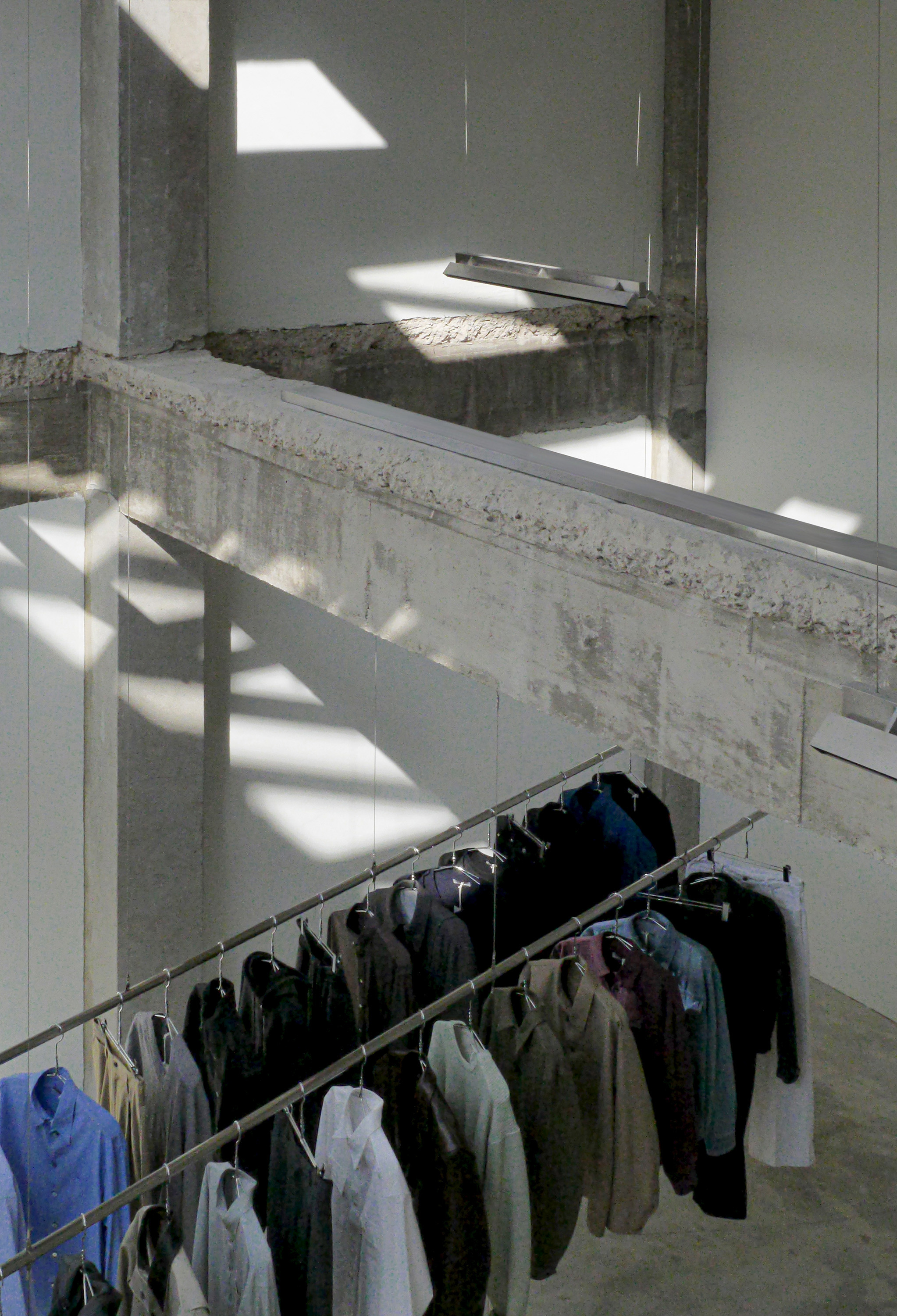 서로 다른 크기의 슬래브 사이에서는 예상치 못한 공간 장면이 등장한다. 1층과 2층 일부는 하나의 통합된 볼륨으로 연결되고, 빛과 공기가 자유롭게 흐르며, 기존 구조의 보와 기둥은 그대로 드러난다. 이 흔적은 공간에 시간의 층위를 남긴다. 그 사이를 오가는 사람들의 움직임과 행잉 랙에 걸린 의류가 겹쳐지며, 옷은 마치 공중에 떠 있는 듯한 인상을 만든다.