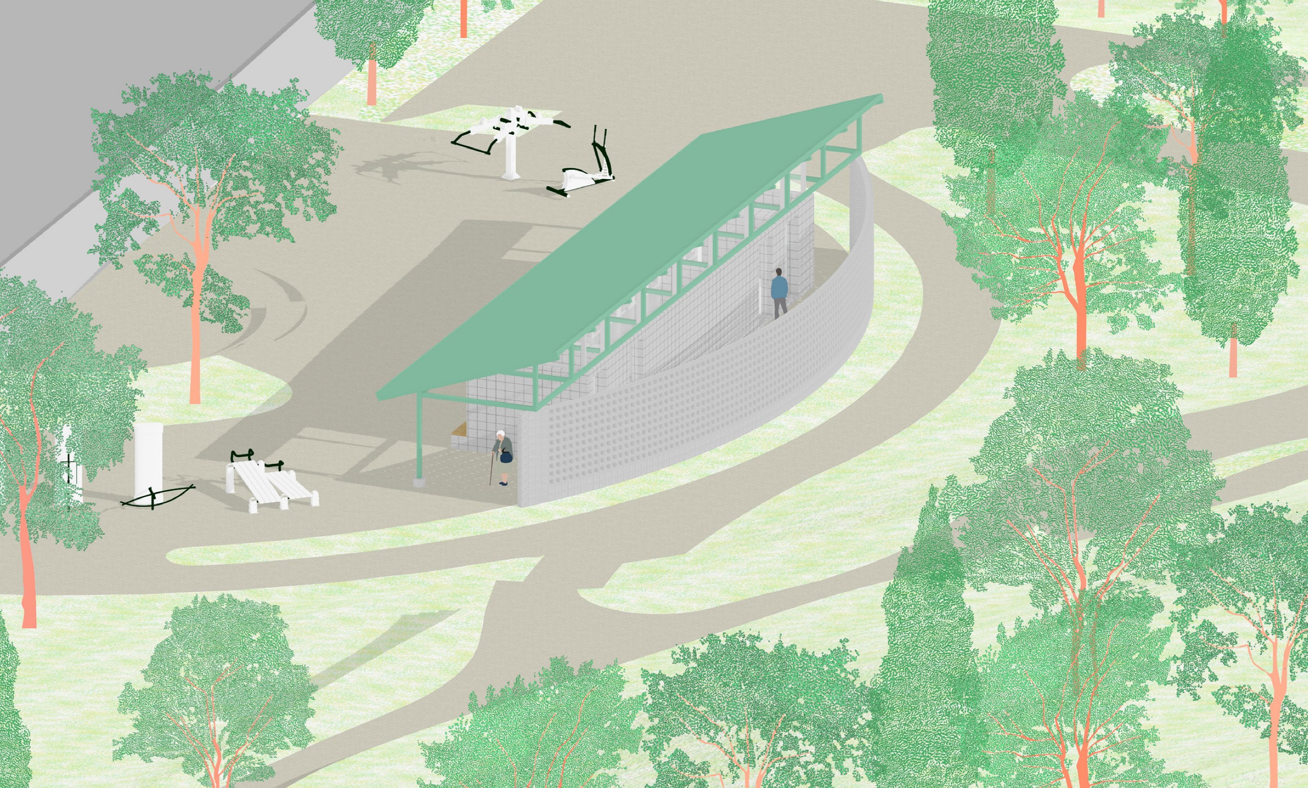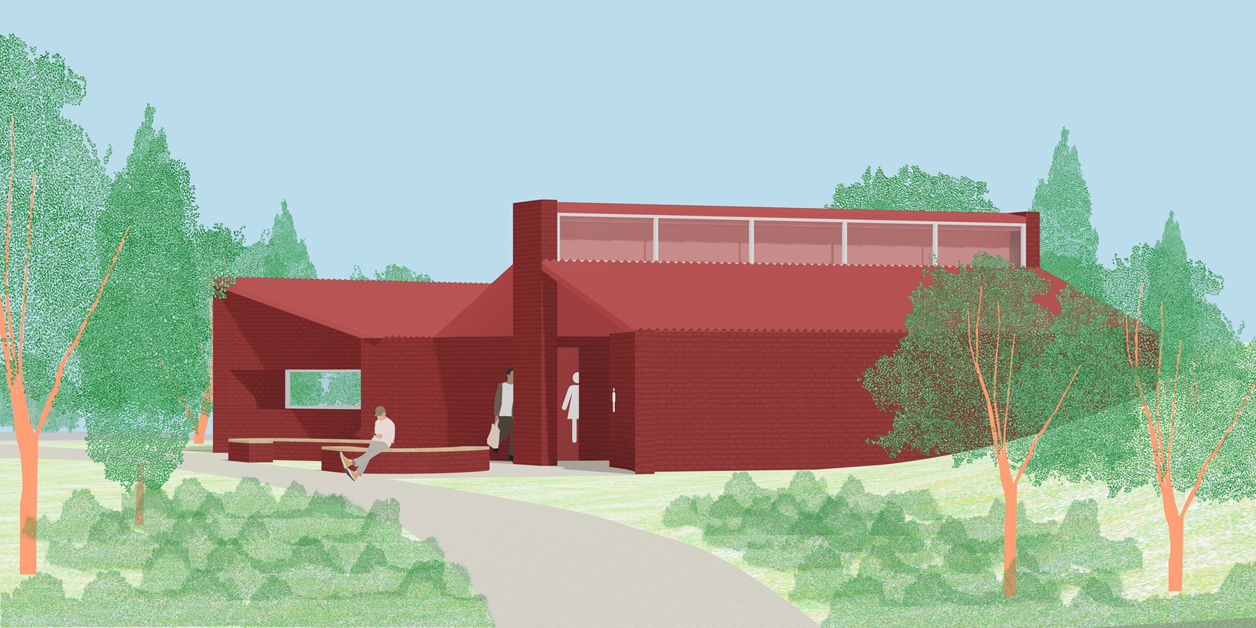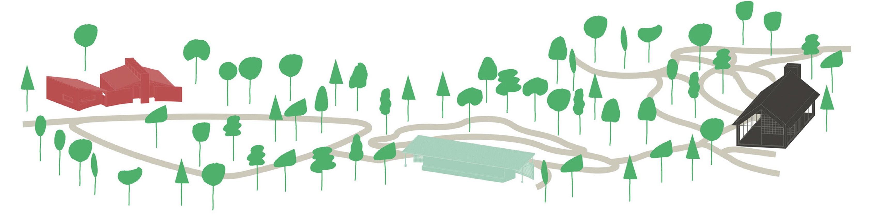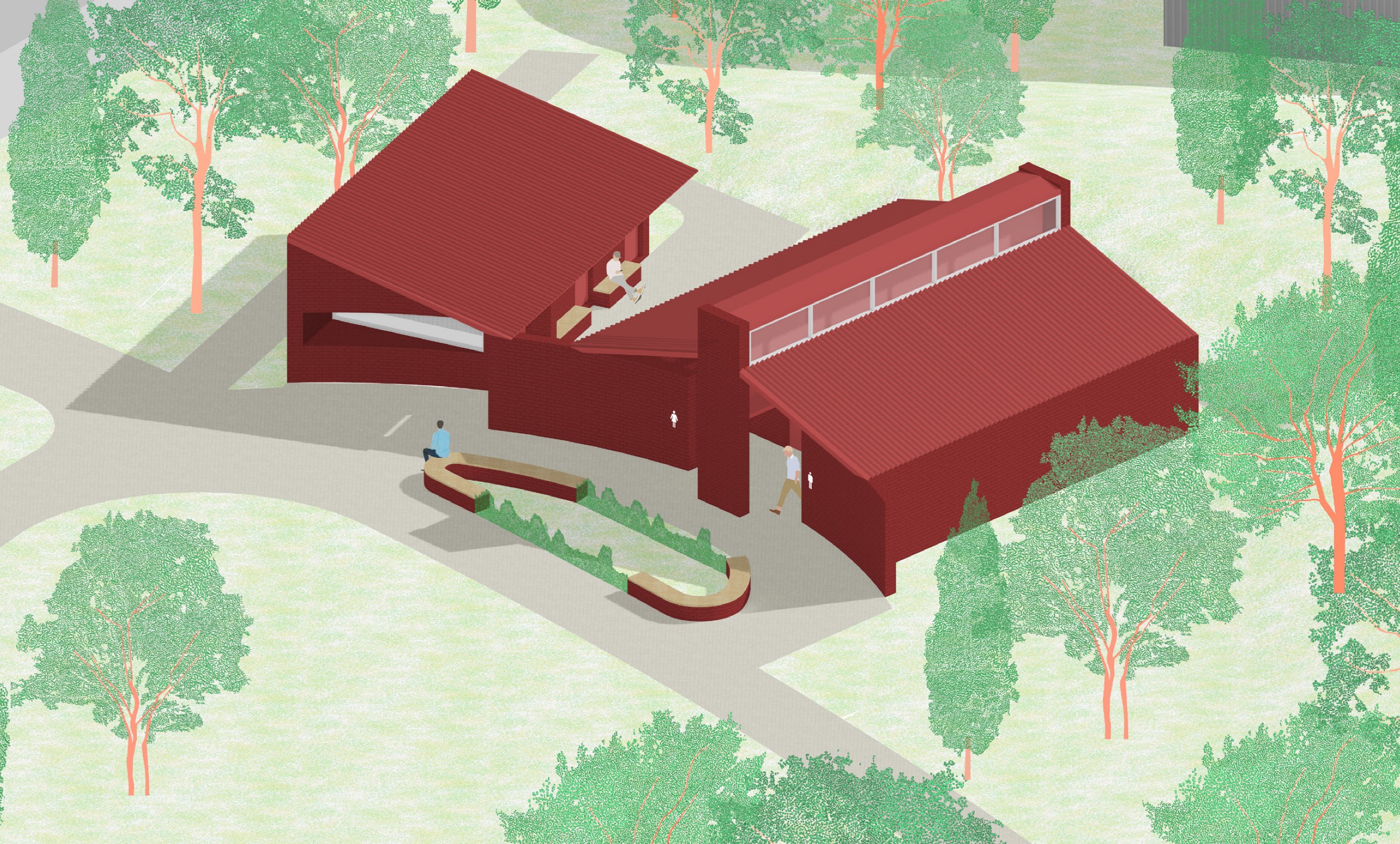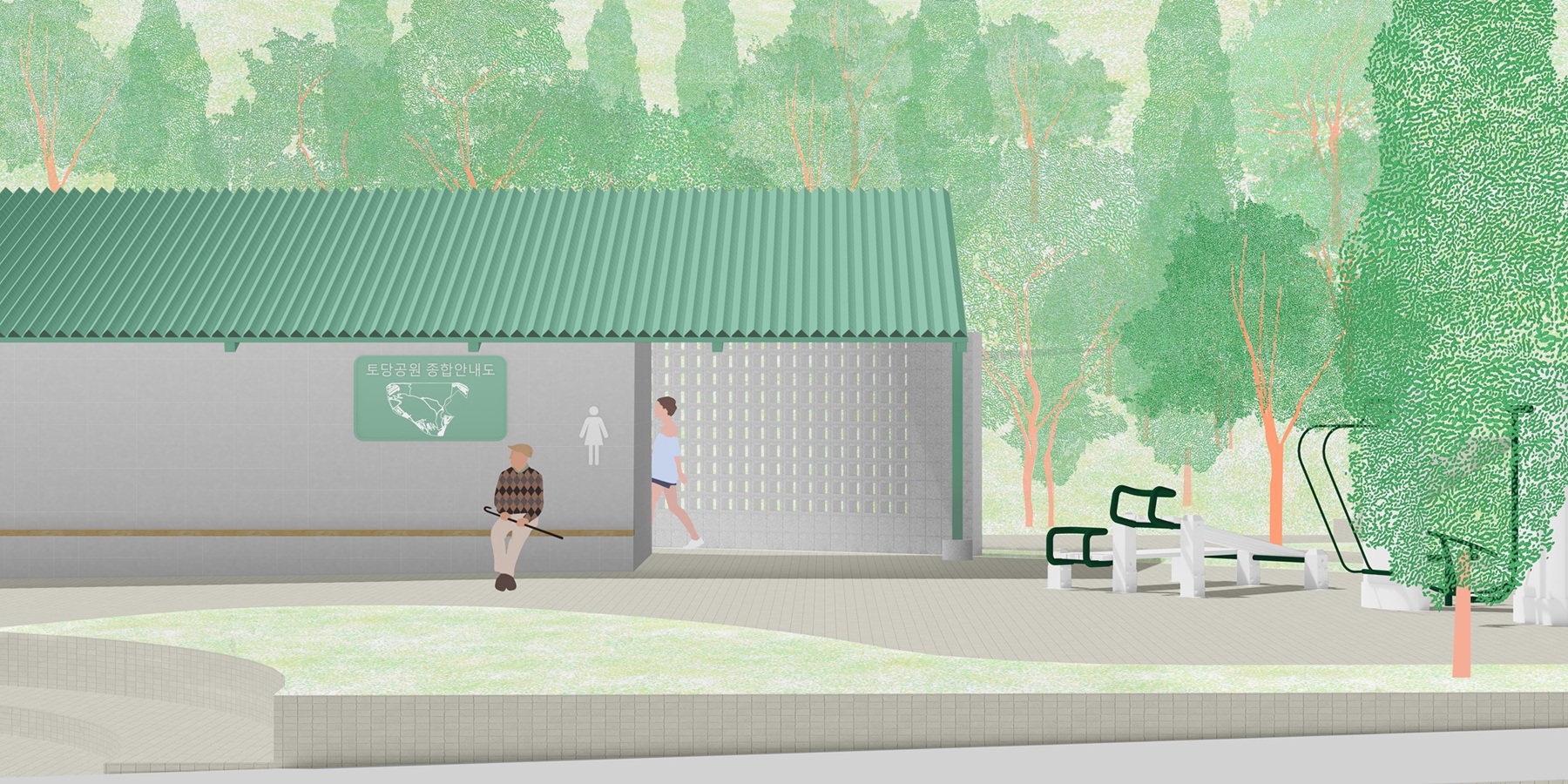 숲속의 작은 오두막은 길을 걷는 사람에게 방향을 제시하고, 잠시 머물고 쉴 수 있는... 이정표의 공간이다. 우리는 이 공원 속에 잠시 쉬어 갈 수 있는 3가지의 작은 오두막을 제안하려 한다. 단순히 걷다 스치는 공간이 아닌, 마치 숲속의 오두막처럼 머물며, 교류할 수 있는 장소가 되었으면 한다.블랙/올리브/레드로 구성된 세 오두막은 서로 다른 기능을 담고 있지만, 오두막의 원형을 공유한다. 익숙한 박공/경사 지붕과 서로 다른 3가지의 색을 통해 넓은 공원 속에서 각자의 위치를 알려주는 이정표로 작용하며, 또 그 지붕 아래에는 잠시 쉬어 갈 수 있는... 작지만 사람들의 기억 속에 오랫동안 남는 토당공원만의 특별한 장소가 되었으면 한다.