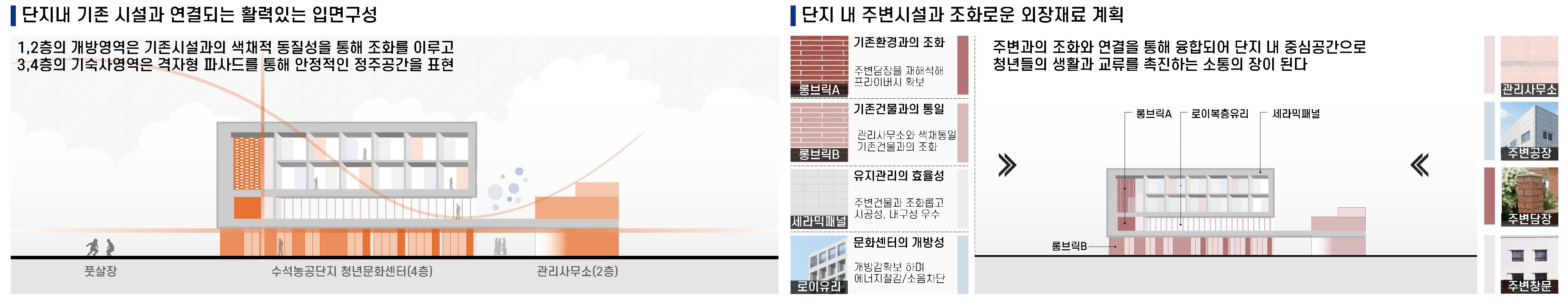 저층부인 1~2층은 모두에게 개방된 문화·복지 영역으로 계획되어, 식당, 체력단련실, 교육실 등 다양한 프로그램을 수용하는 열린 커뮤니티 공간으로 구성된다. 특히 기존 관리사무소를 문화 공간으로 리모델링하는 제안을 통해, 청년문화센터의 기능과 프로그램이 유연하게 확장될 수 있는 기반을 마련하였다.