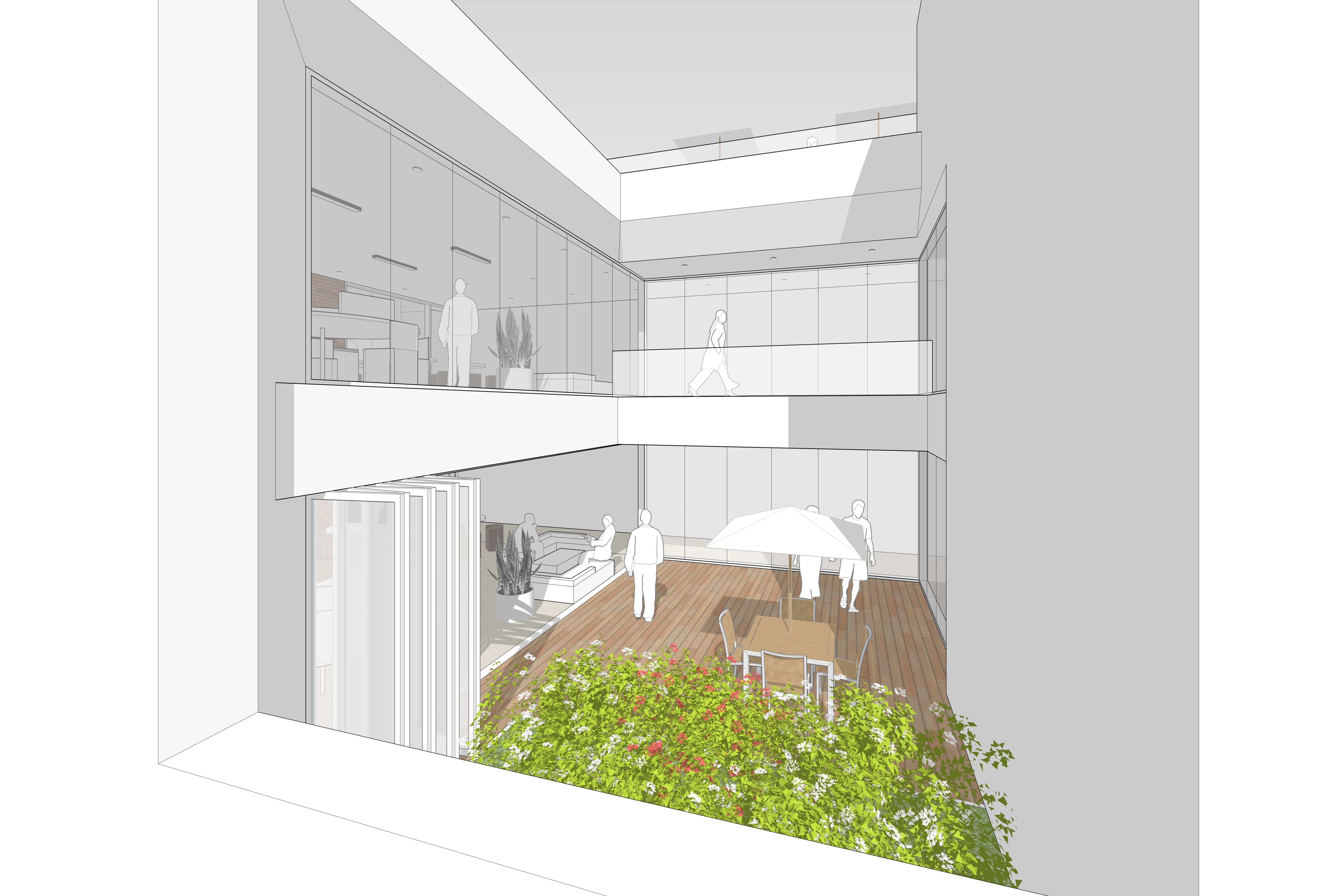 중심 보행가로를 따라 배치된 외부 공간들은 서로 마주보며 연속적인 장면을 형성하고, 평상시에는 내부 프로그램과 자연스럽게 연계되어 확장된 활동 영역으로 작동한다. 더불어 단지 내 입주 기업들의 휴게 및 행사 시에는 유연하게 대응하는 다목적 공간으로 활용되며, 다양한 커뮤니티 활동이 일상 속에서 자연스럽게 스며드는 열린 장소로 기능한다.