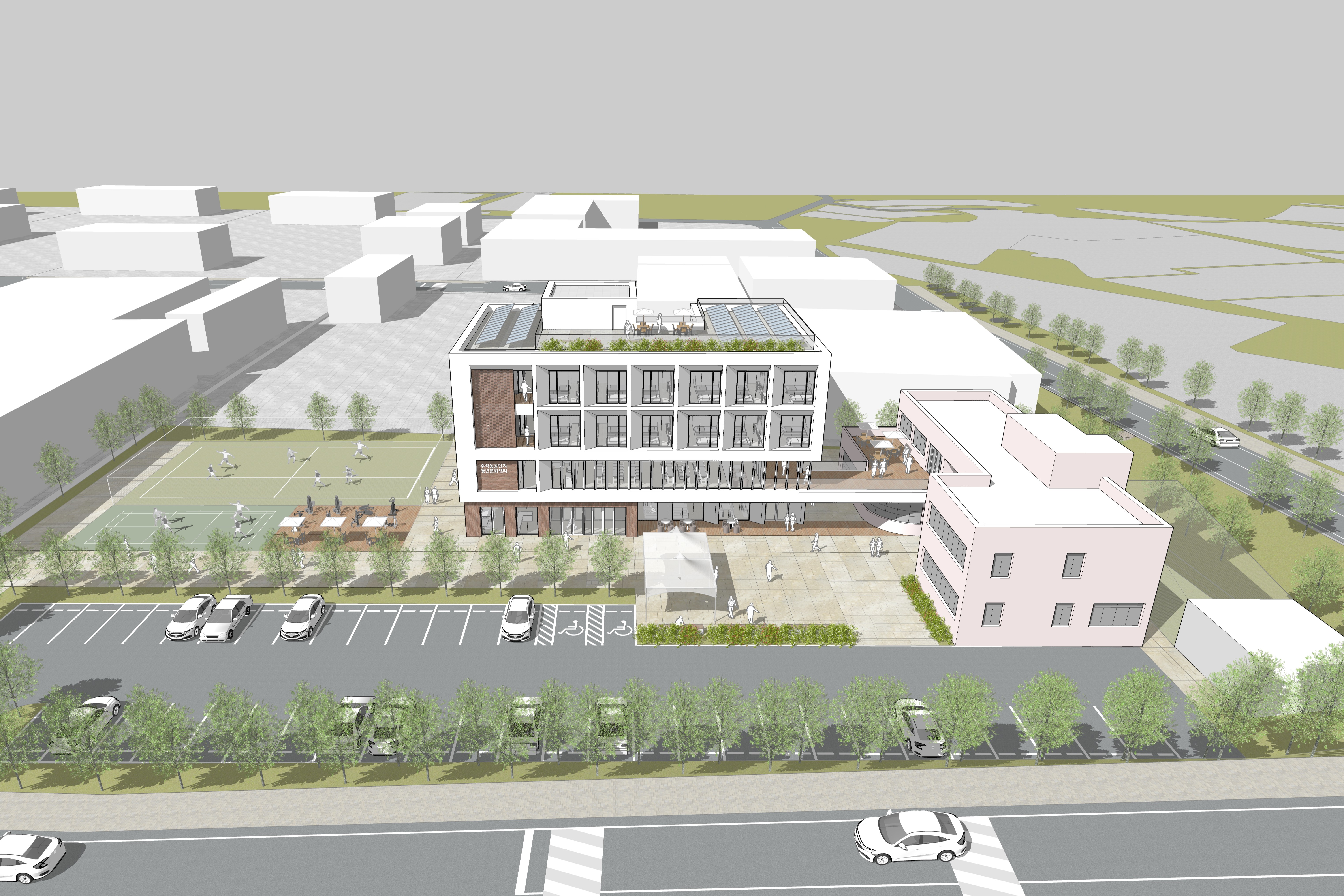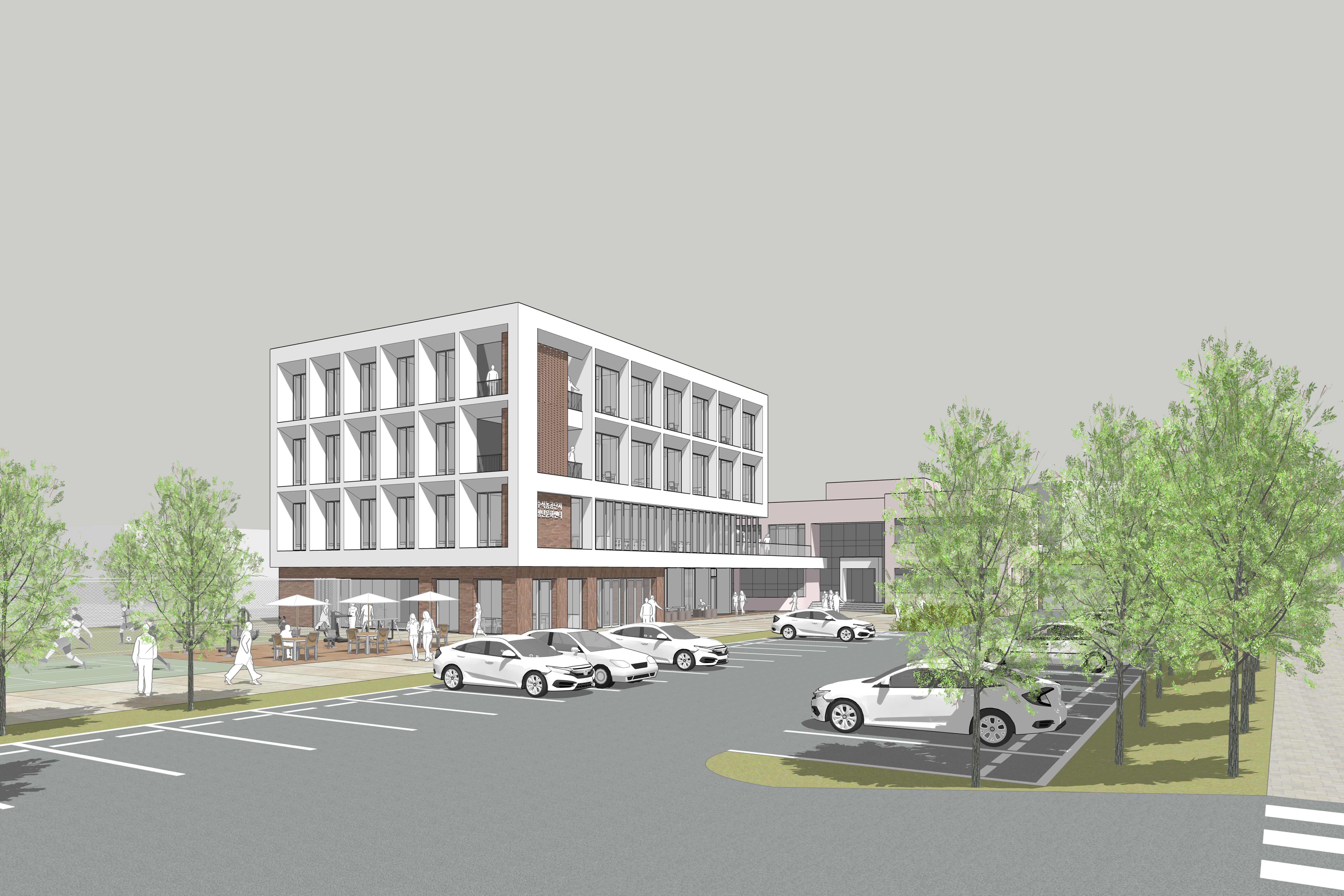 농공단지 초입에 위치한 이 시설은 기존 관리사무소와 연결되며 단지의 첫인상을 형성하는 상징적 관문이다. 정면성을 강조한 배치는 방문자에게 명확한 인지성을 부여하는 동시에 공간의 정체성을 강화한다. 또한 기존에 보행과 차량 동선이 혼재되어 있던 환경을 재정비하여, 보차를 명확히 분리함으로써 보다 안전하고 쾌적한 보행 환경을 구축하였다.