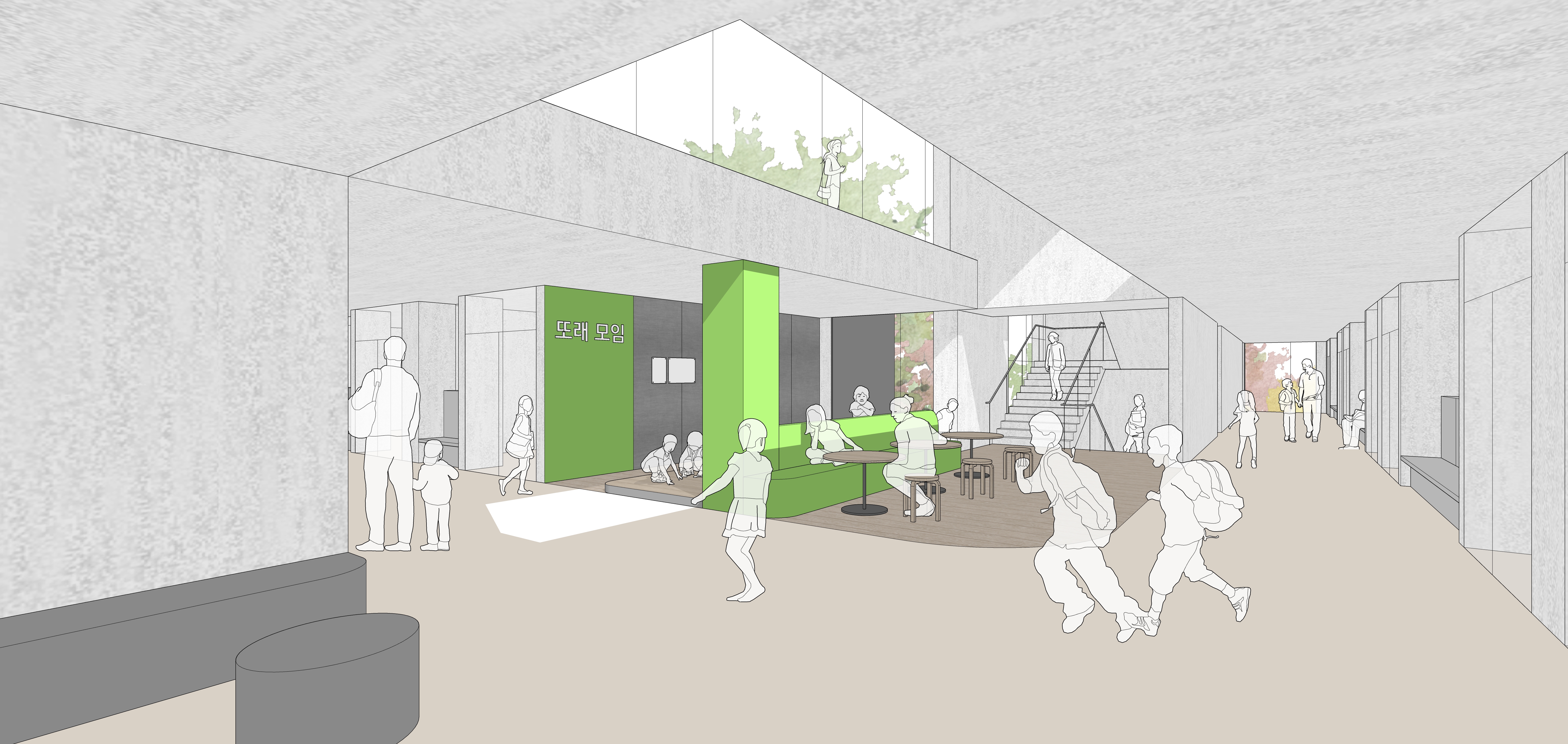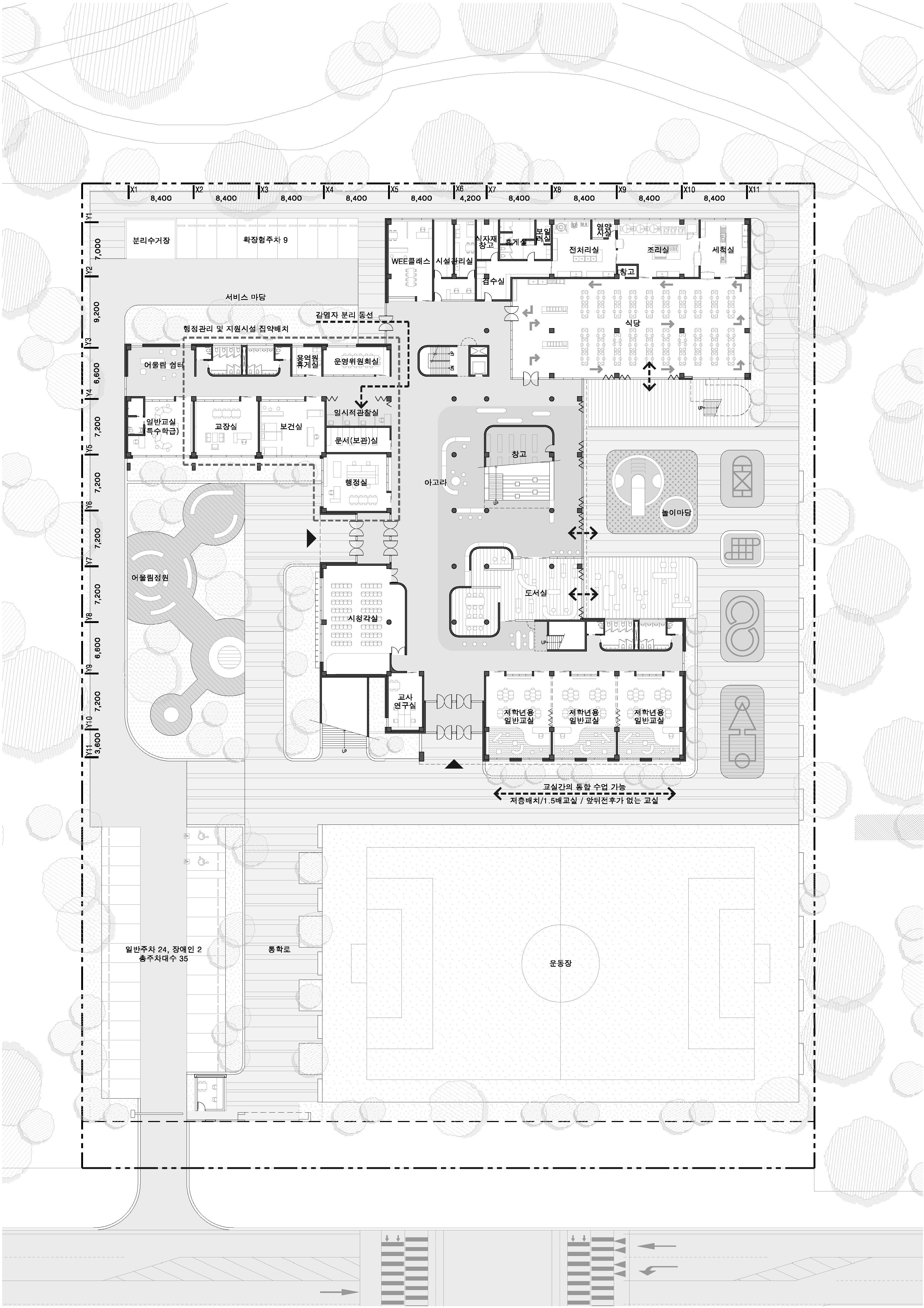 소유보다 경험이 중요해진 시대, 학교는 단일 교실 중심의 학습을 넘어 필요에 따라 선택·이동·체류가 가능한 유연한 플랫폼으로 전환되고 있다. 노드 캠퍼스(Node Campus)는 학교 곳곳에 학습·휴게·교류의 거점을 분산 배치하고, 이를 공용 동선과 시각적 연속성으로 연결해 다양한 활동이 자연스럽게 전이되도록 하는 공간 전략을 의미한다. 강율초는 운동장, 어울림정원, 놀이마당, 아고라, 포럼스텝, 포럼노드, 또래모임노드 등 성격이 다른 노드들로 구성되고 서로 연결된다. 각 노드는 학생과 지역 주민이 필요에 따라 선택해 머무르고 소통할 수 있는 기반이 되어, 학교를 열린 교육과 교류의 장으로 확장한다.