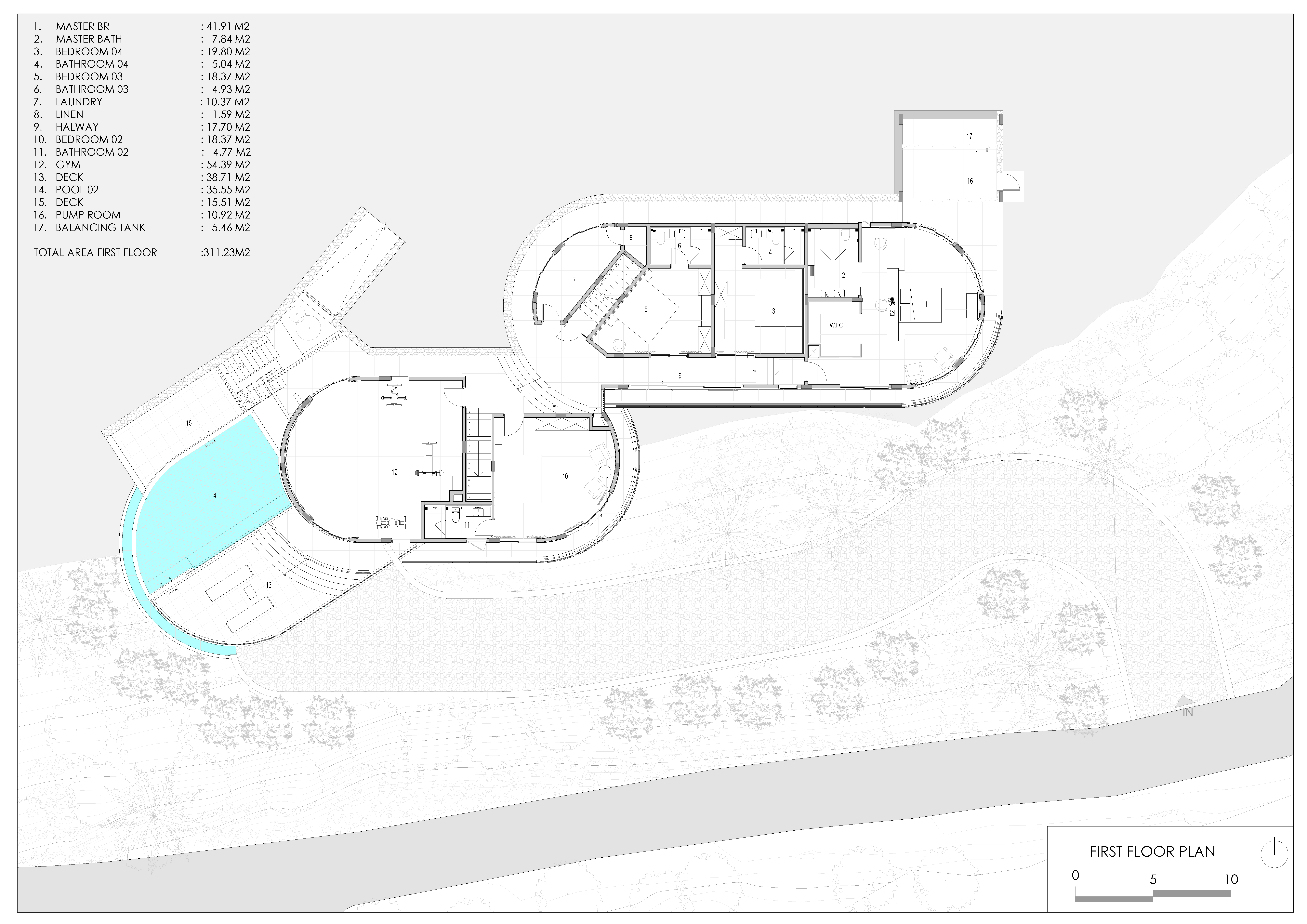 평면은 원형 구조를 중심으로 구성되어 있다. 원형 평면의 중심에는 사람들이 많이 모이는 라운지, 다이닝 공간, 벽난로와 같은 공용 공간을 두어 물리적·상징적으로 공간을 구성했다. 그 주변에는 두 가족을 위한 프라이빗한 공간으로 구성되었으며, 최상부에는 만을 향해 시야가 열려 조망이 가능한 요가 플랫폼도 배치되어 있다.