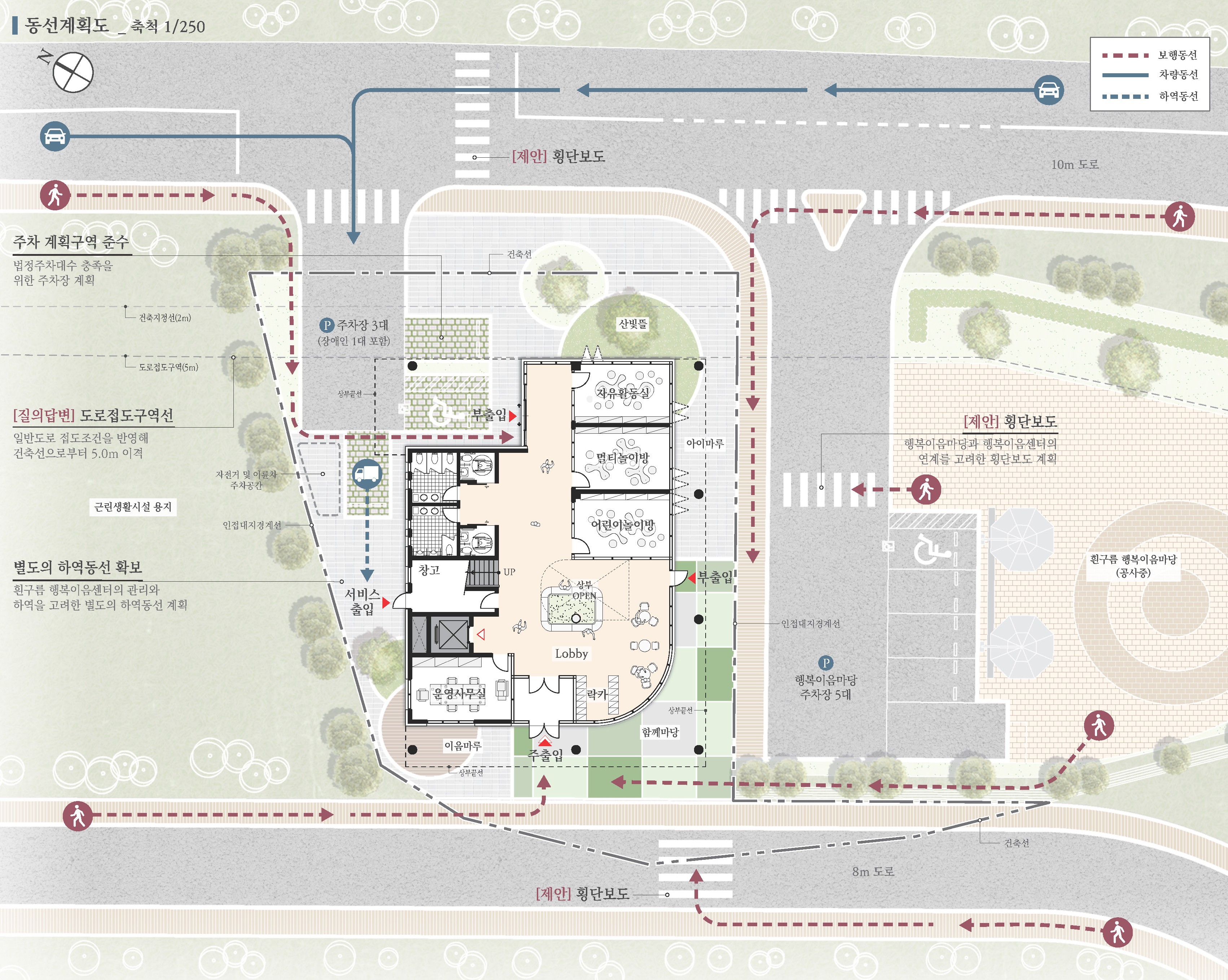 주택단지 방향에서의 보행접근성이 높을 것으로 판단하여 인접 위치에 주출입구를 배치하고, 자연스럽게 동선이 유도되도록 계획하였다. 다양한 연령층 이용을 고려해 다방향 보행접근과 횡단보도를 반영하고, 출입구를 분산 배치하여 혼잡을 완화하였다. 아울러 외부공간을 조성해 주민과 이용자에게 휴식과 교류의 장소를 제공하였다.