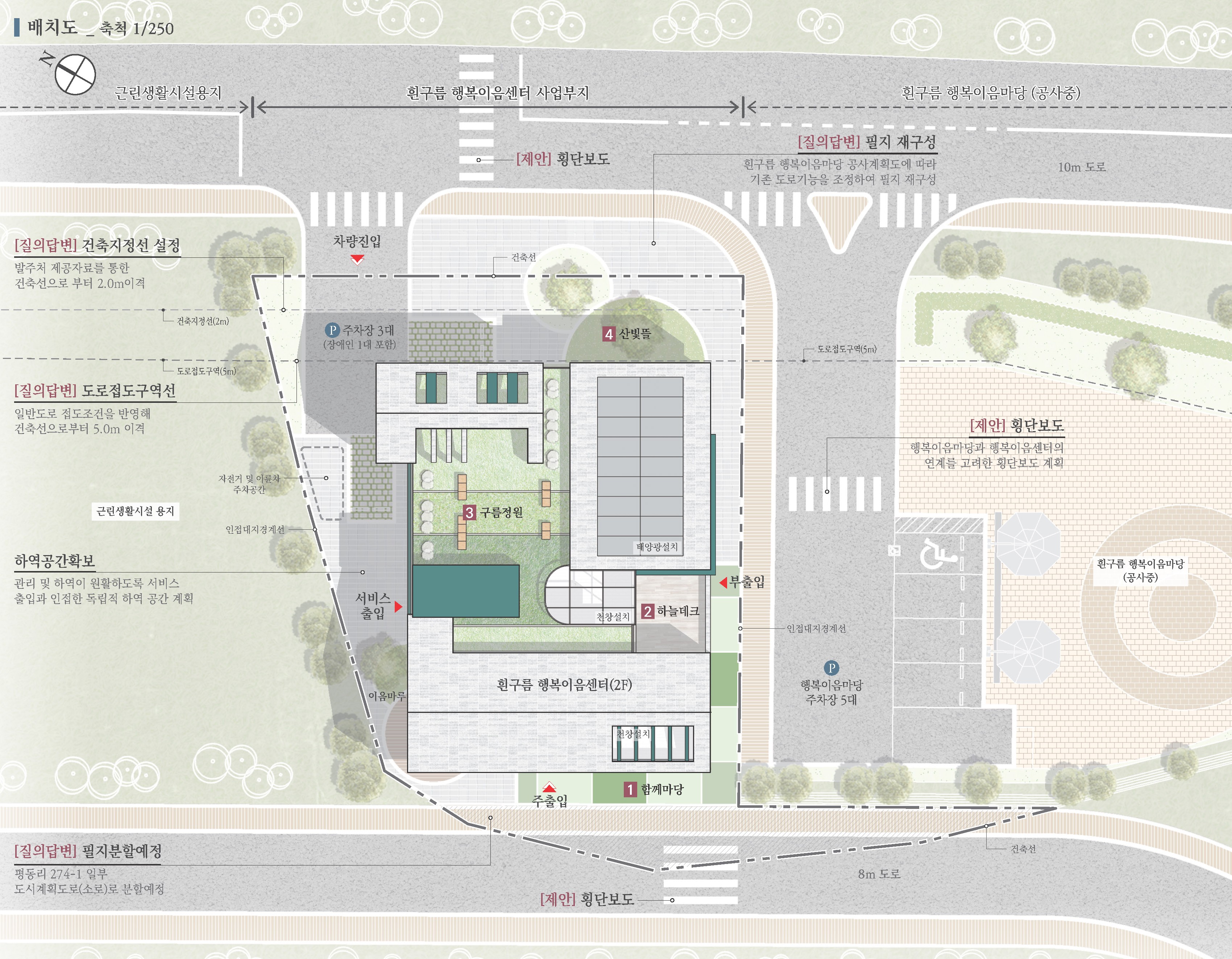 대지분석을 통해 마을의 성격과 부지활용성을 고려하고, 현재 공사중인 대상지 남측의 흰구름 행복이음마당과의 연계를 바탕으로 ‘흰구름 행복이음센터’를 계획하였다. 또한 주변 주민여가시설과의 관계성을 고려한 연계 방안을 마련하였다. 평균 연령대가 높은 지역 특성을 반영하여 보행자 중심의 접근동선을 구성하고, 차량동선과 분리해 안전한 보행환경을 조성하였다.